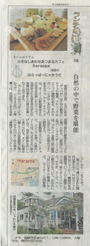 小さなしあわせあつまるカフェharappa|新聞|神戸新聞「ランチどこいこ?」コーナーに掲載されました♪2023