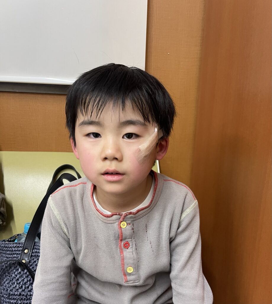 目の横を切ってしまい、かなり傷が深かったので病院へ行くことになり、劇は諦めました。痛かったね〜頑張ったよ。