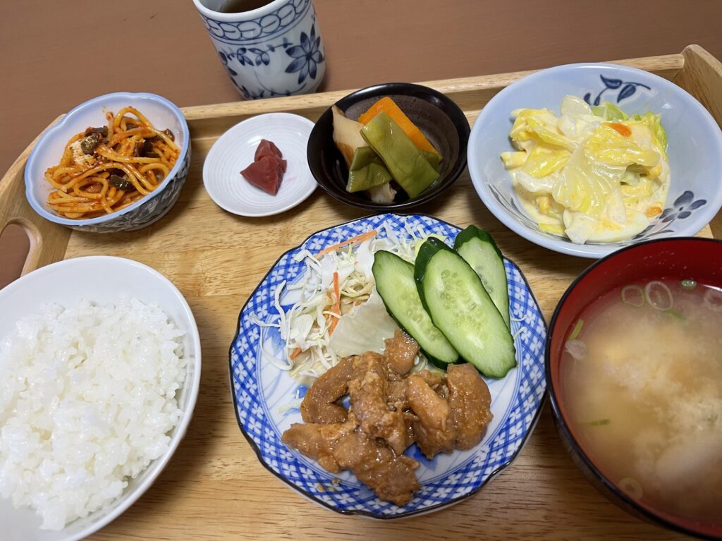 今日のデイのご飯は、豚肉の味噌炒めと、キャベツのサラダ、パスタ、煮物など、バランス良くていつも美味しいです。