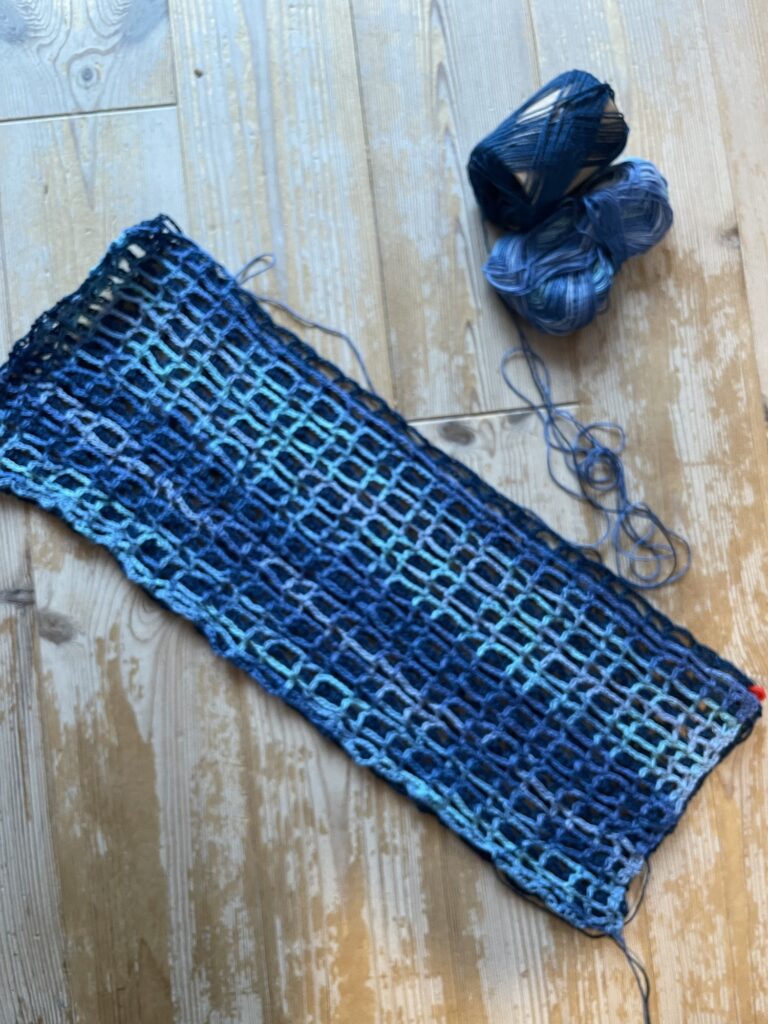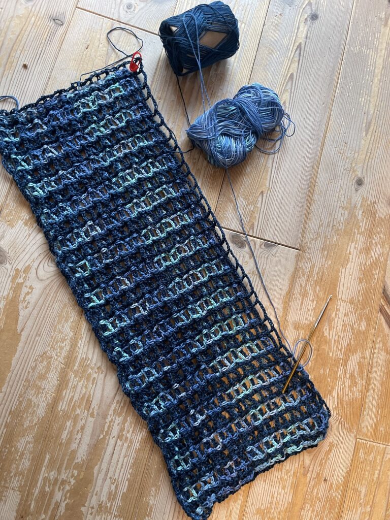 2本の糸で重なり合って追っかけるように編む変わった編み方。もう少し薄い色を使いたかったなあ。