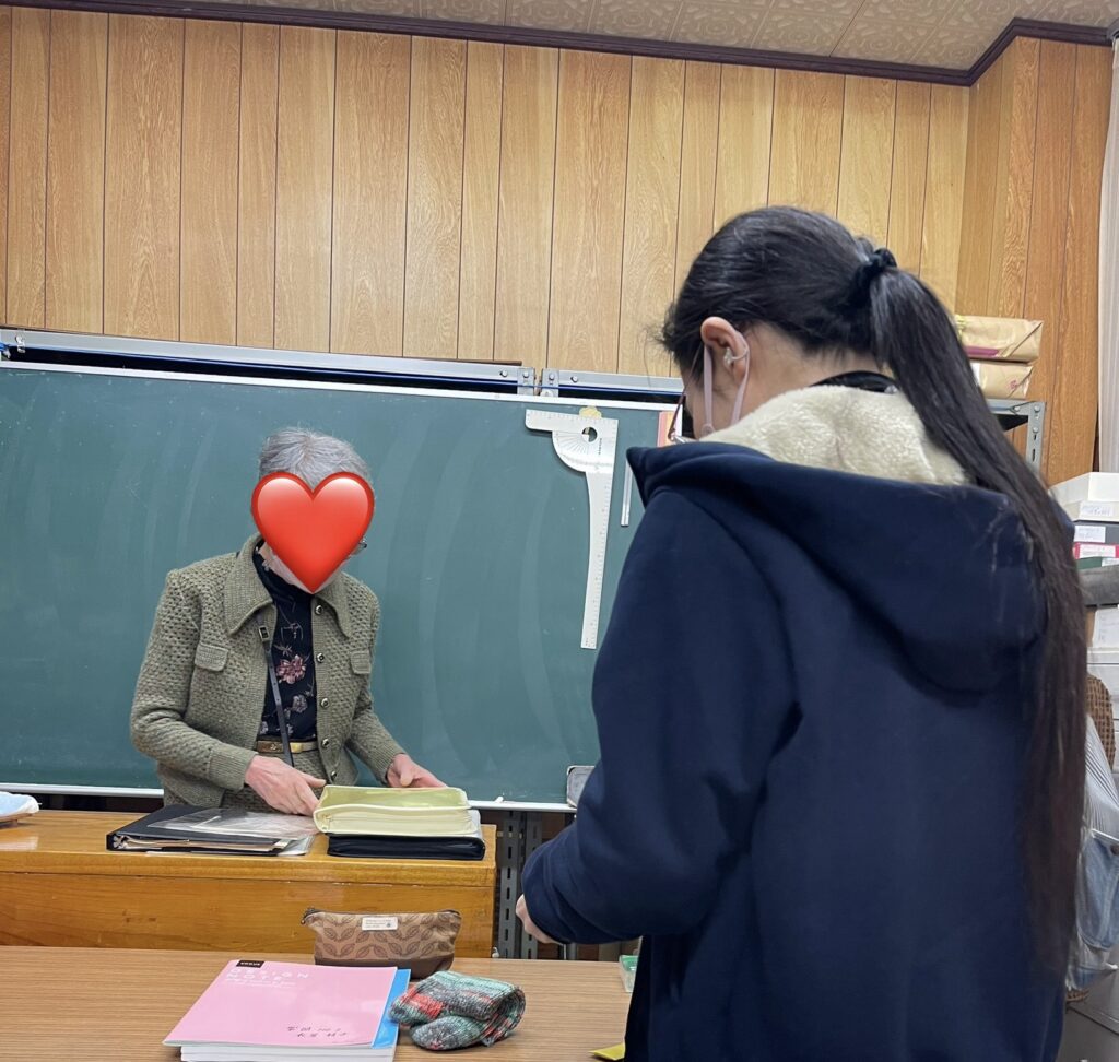 先生は手編みの襟付きジャケットとスカートのアンサンブル