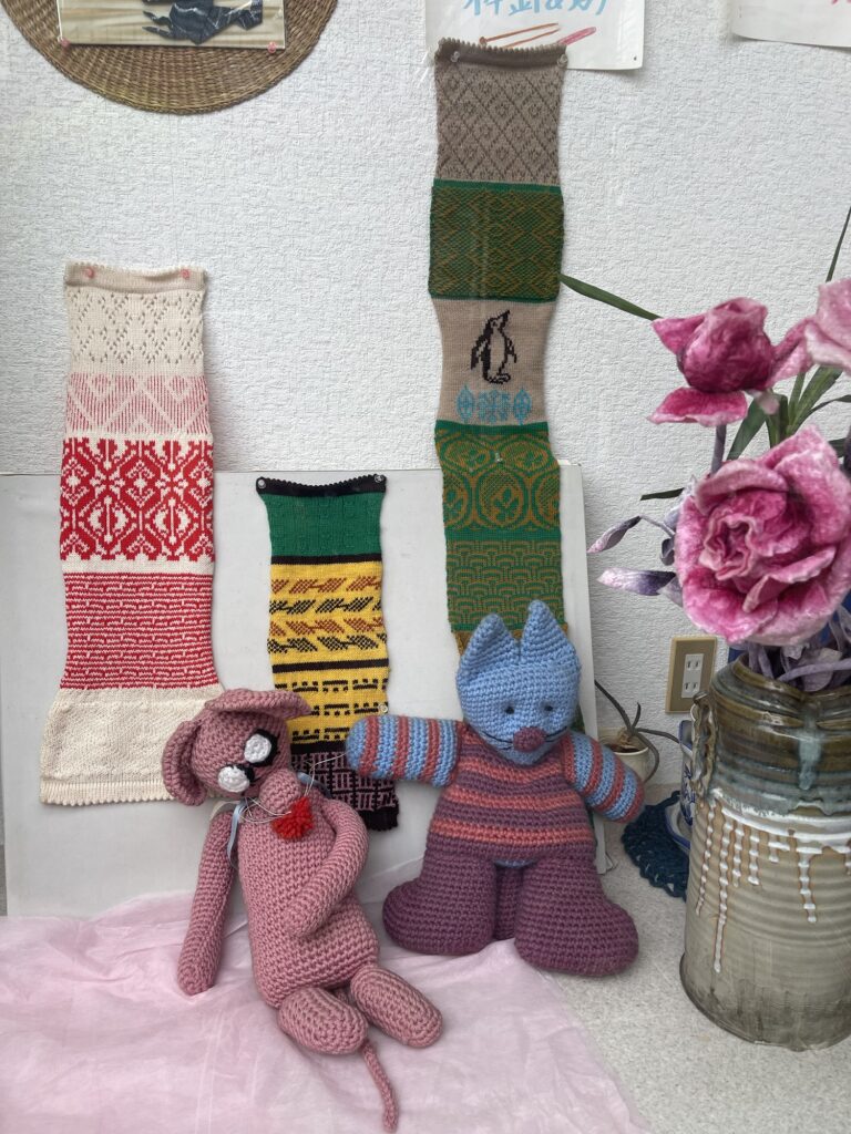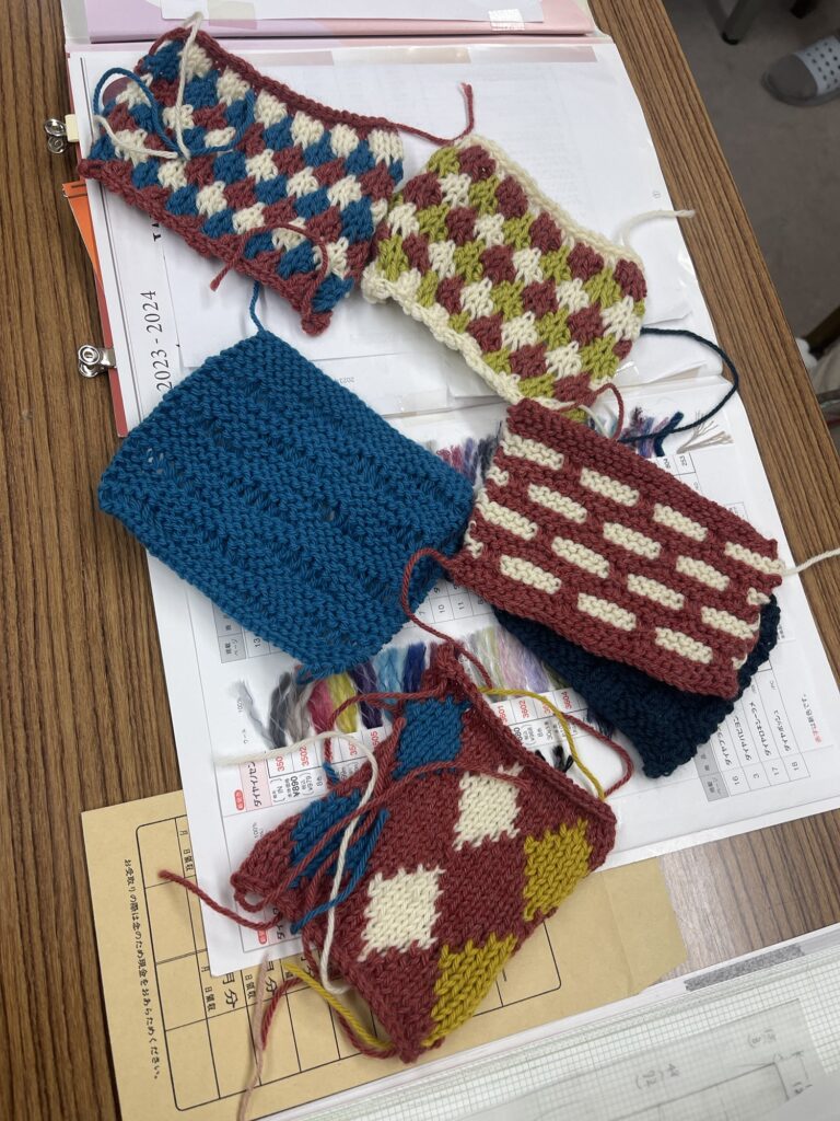 機械編みの編み込みの練習用に編まれたものもカラフルでかわいい柄。