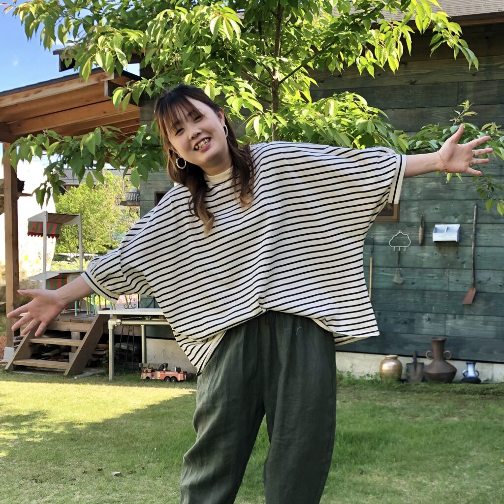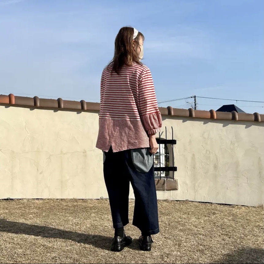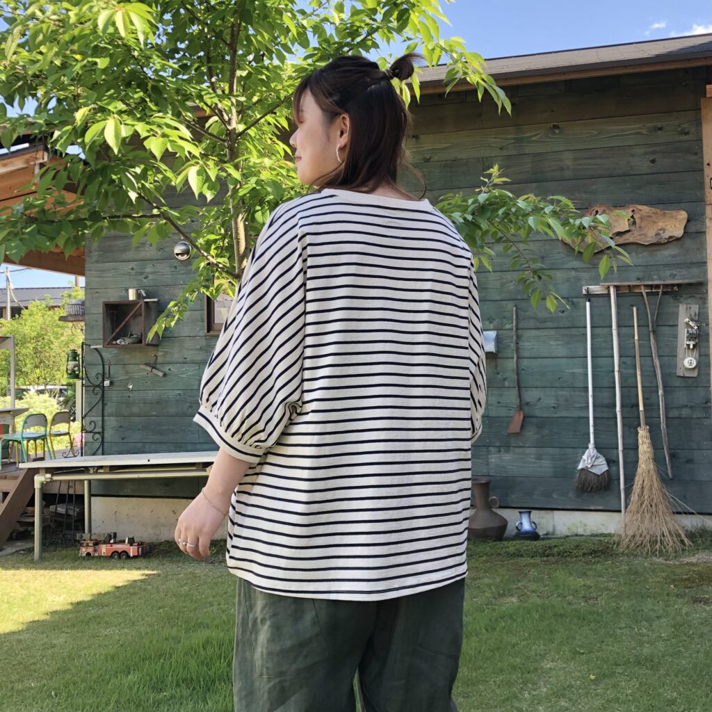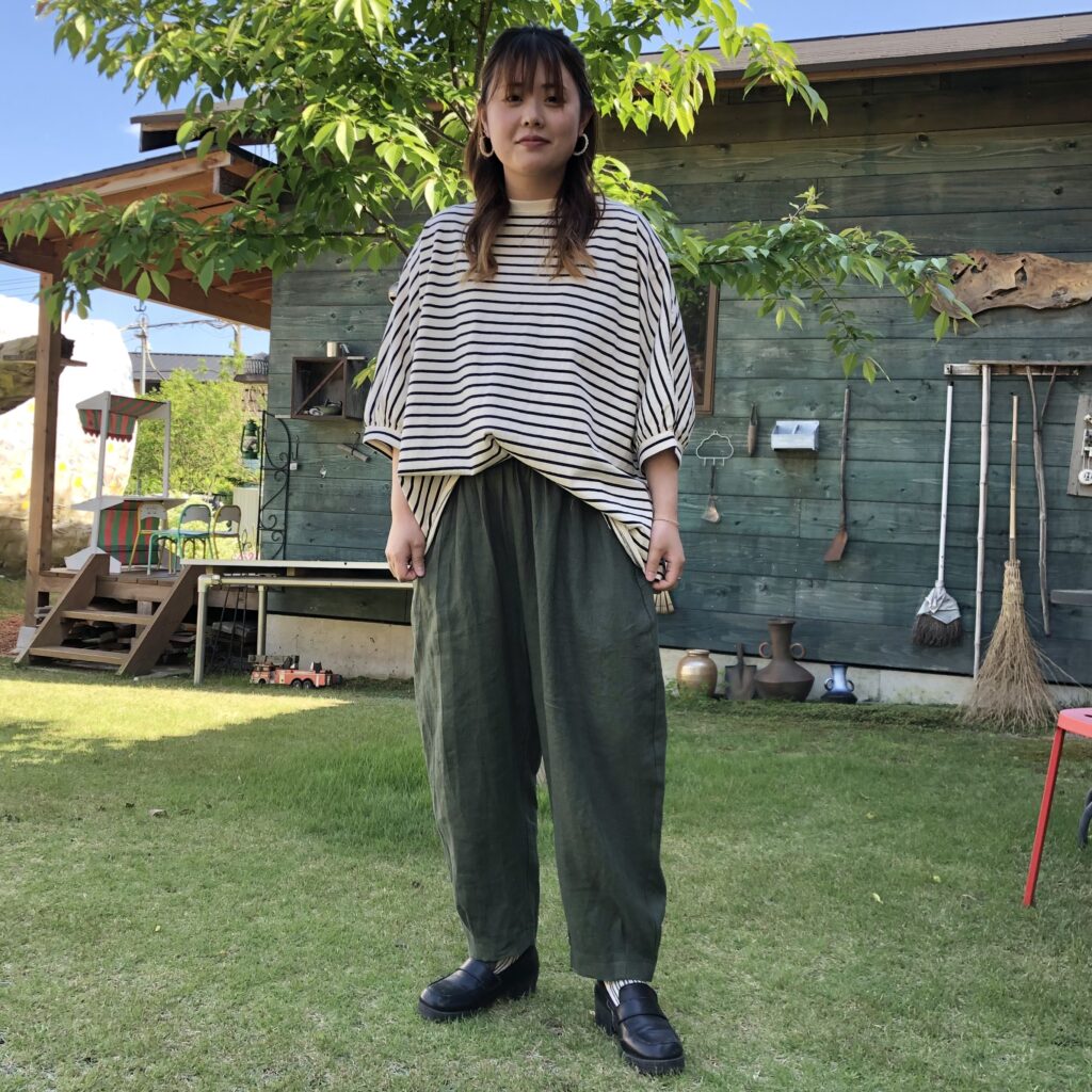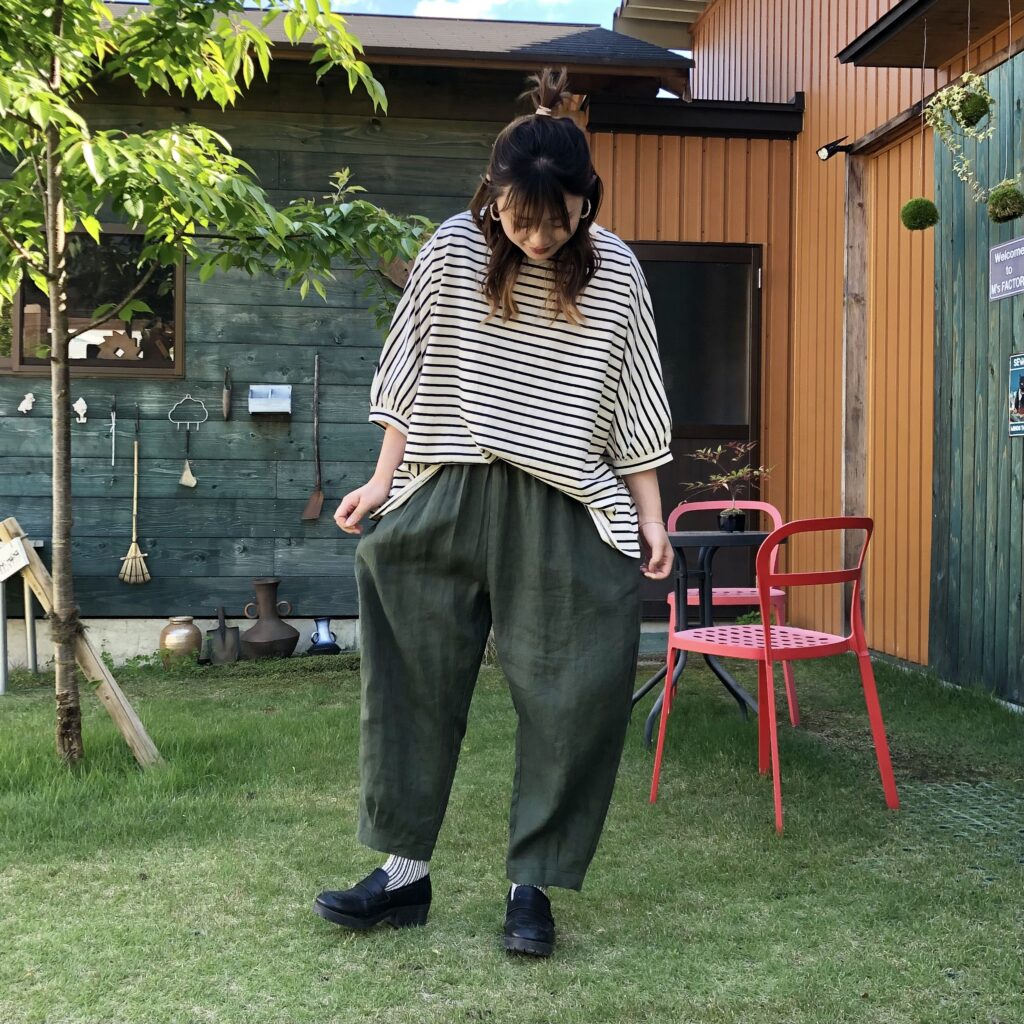 ボーダーゆるっとTシャツ(¥5,060)も、9番手リネン裾タックパンツ(¥11,800)も、どちらもゆとりのあるサイズ設計なので体型を気にせずリラックス感を楽しめますよ☺️