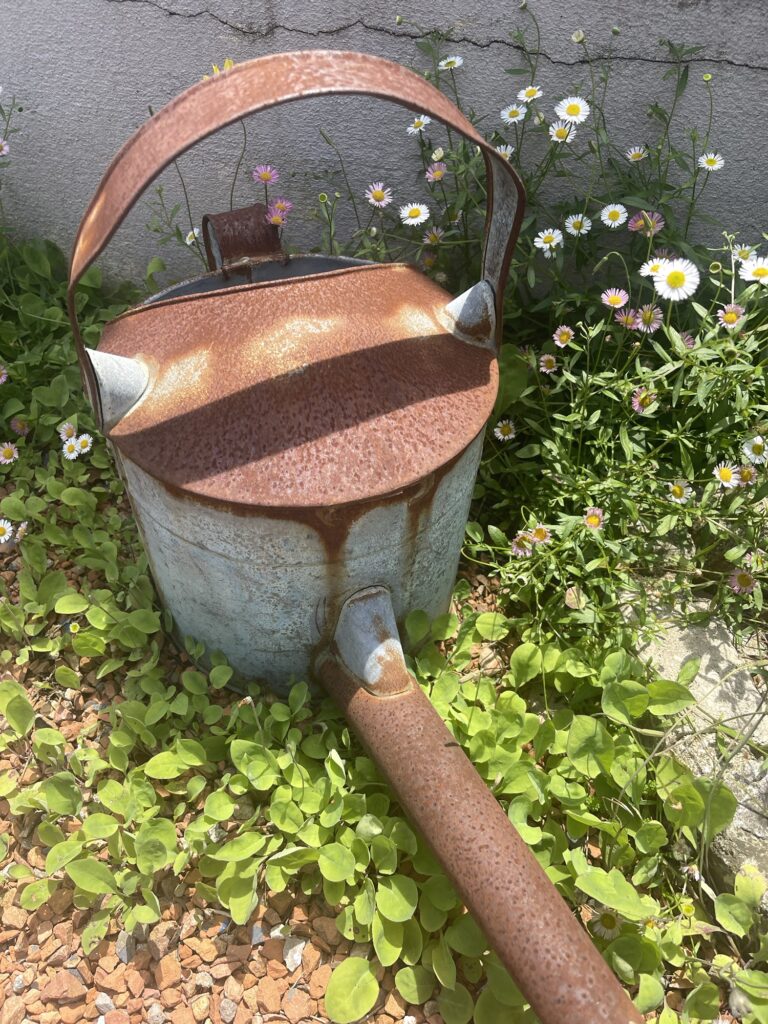 錆びて、穴の空いたジョーロも素敵なオブジェになりますね。