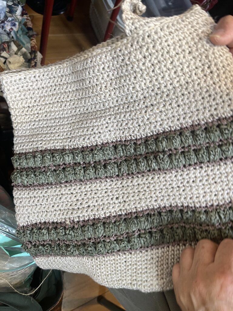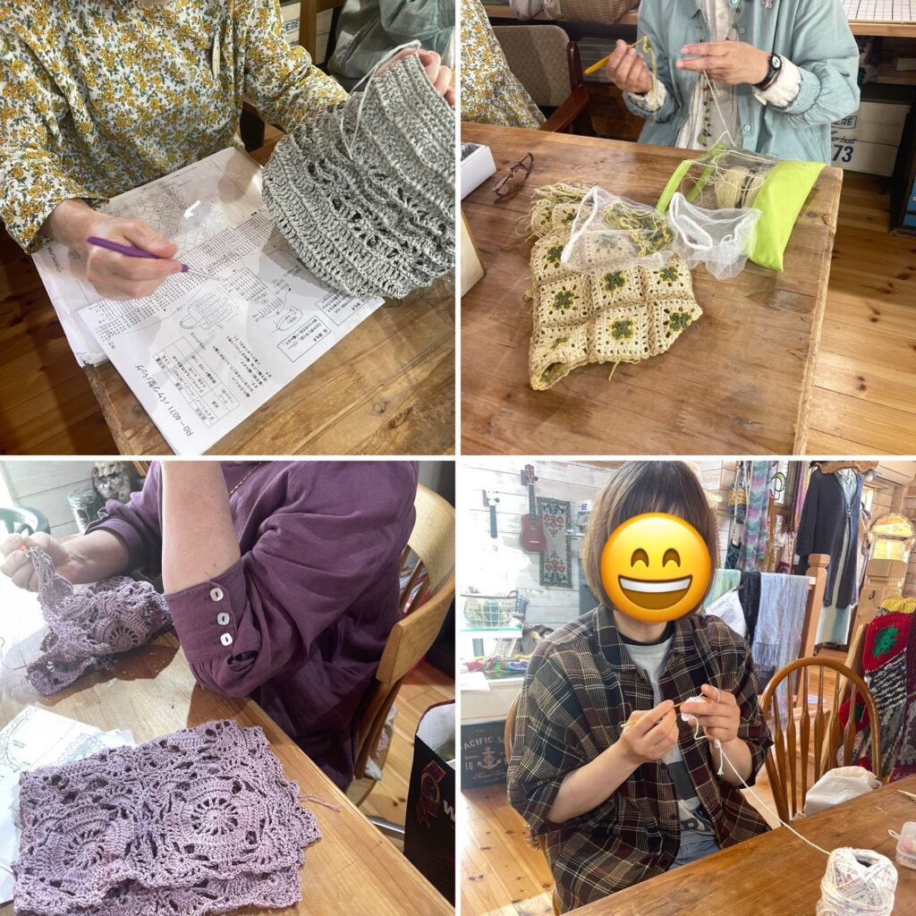 バッグやベストを編んでいるベテランさんも、初めて参加で基礎から細編みの練習の方もみんな一緒で楽しい時間でした。