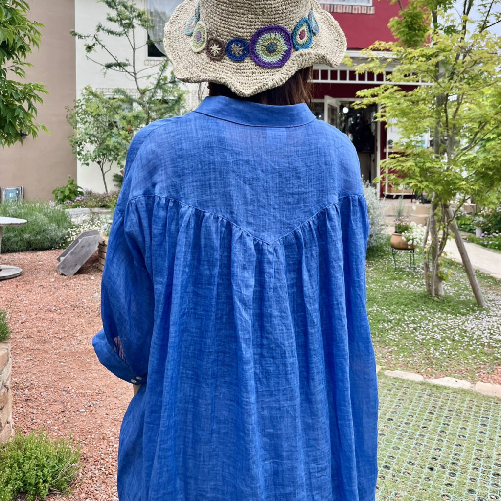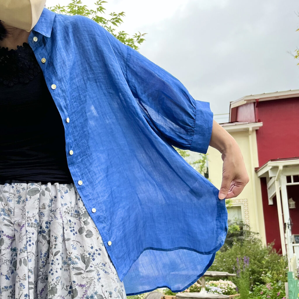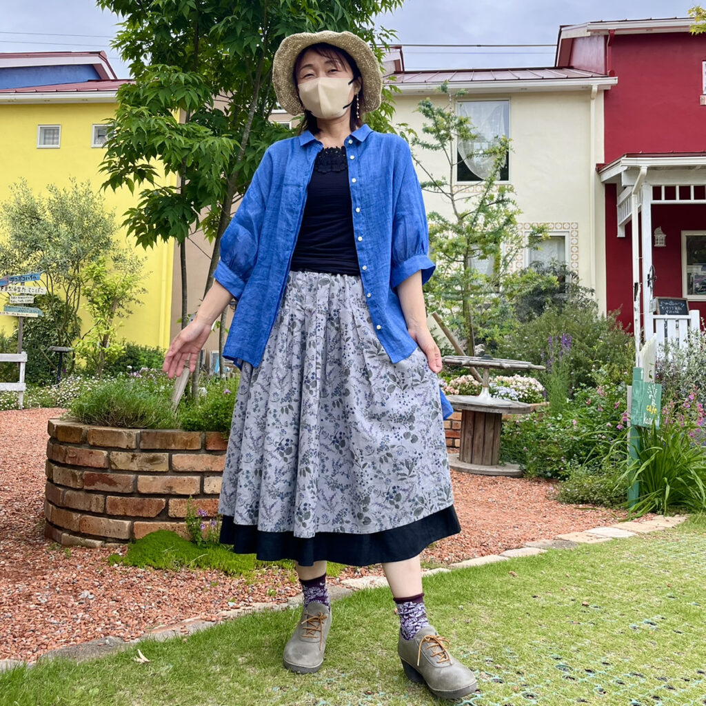 パンツスタイルにかっこよくサラッと羽織りたい気持ちをグッとこらえて、ラミーバックギャザーブラウスを、オリジナルリバーシブルスカートに合わせてみました(たまたま穿いてた笑)。