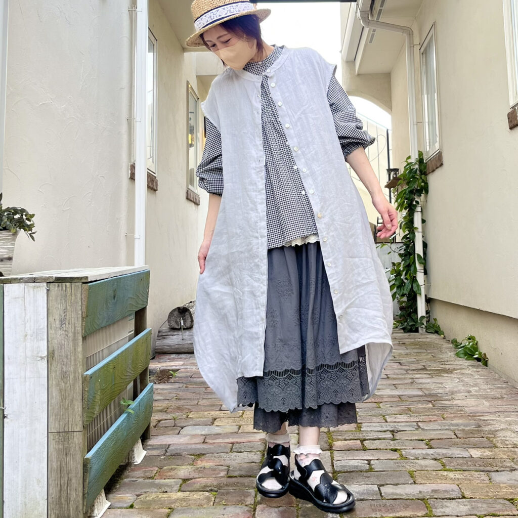 もちろんインナーにタンクトップを着て、かっこよく腕丸出しにも憧れちゃいますが、大人世代やチクチク感が苦手な方は重ね着がおすすめ。。。