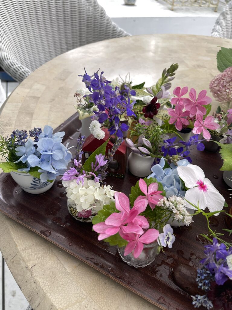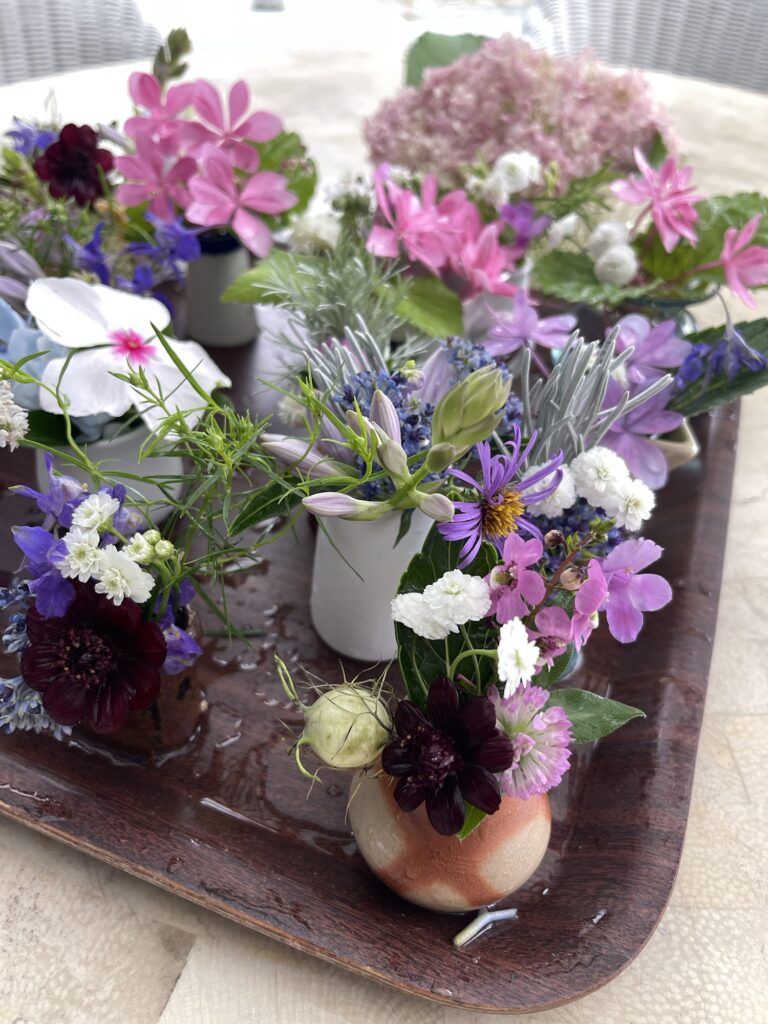 アジサイやギボウシの花、チョコレートコスモスなどをアレンジ。かわいいなあ💕
