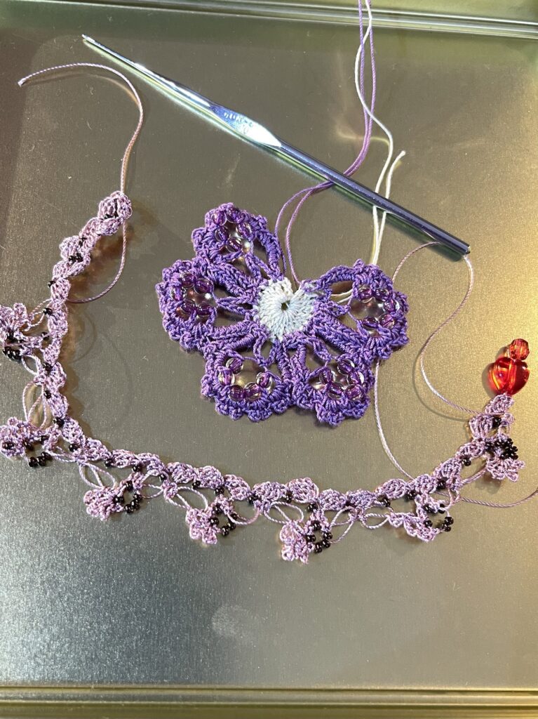 ビーズオヤも編んでみたくなって、ブレスレットとお花を一つ編みました。