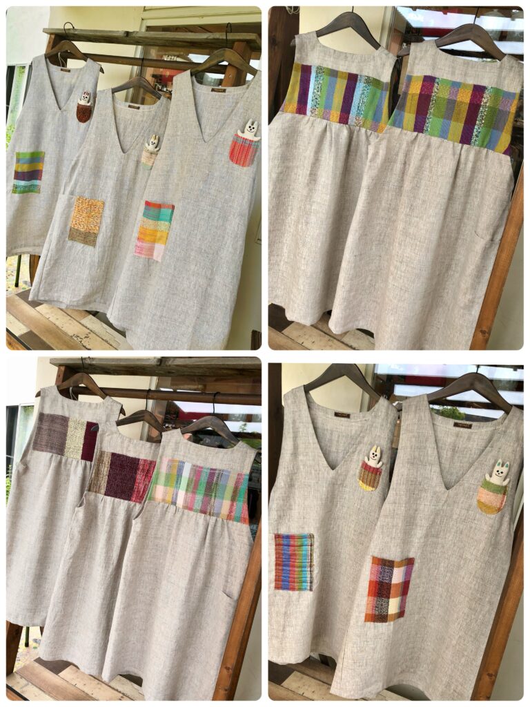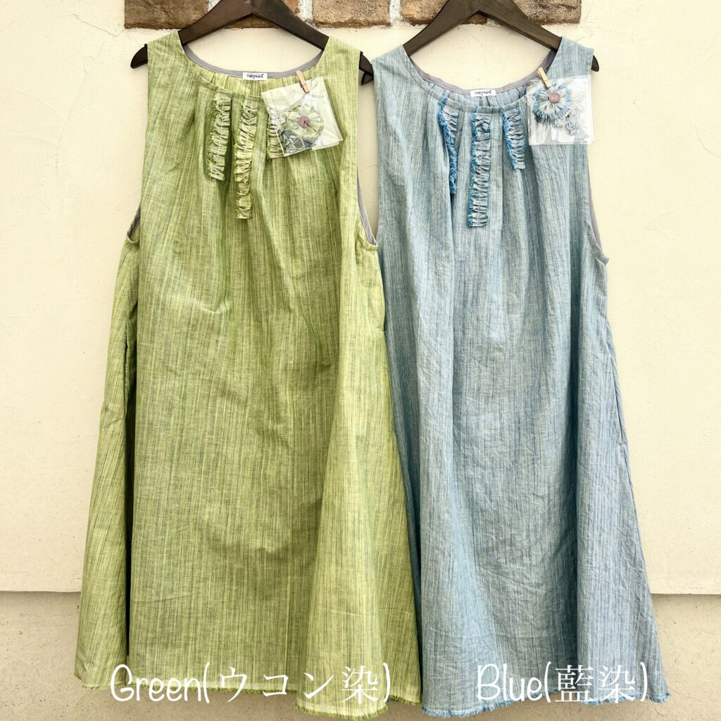 糸の状態からそれぞれ藍染めやウコン染めをし、丁寧に織り上げた生地を使用しています。