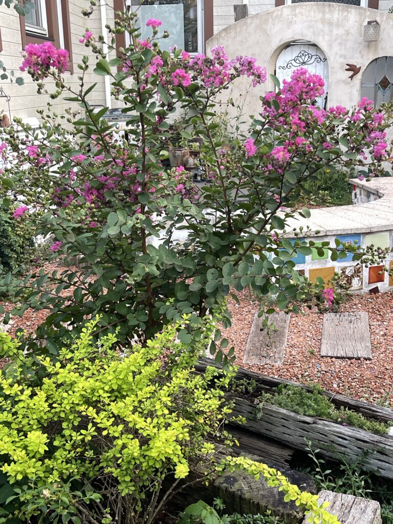 メギの明るい緑とサルスベリのピンクのお花がかわいいな。