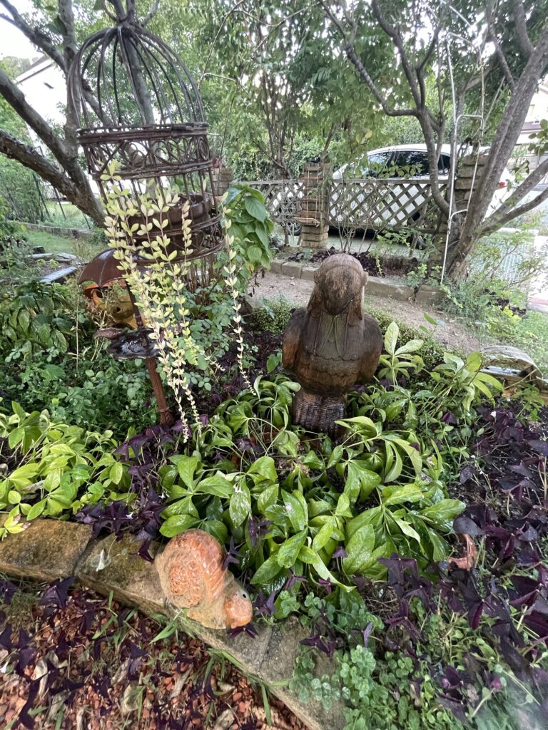 木のオウムさん。長年お庭を見守ってくれてます。あちこち手を入れないといけないところばかり。手が回らないなあ。