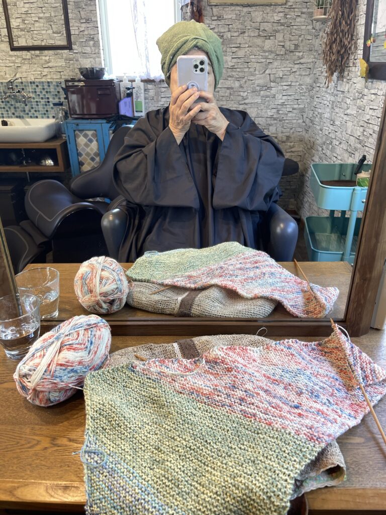 ヘナ中。時間を置いてる間に、編みかけのカイトストールが編めてしまいました。