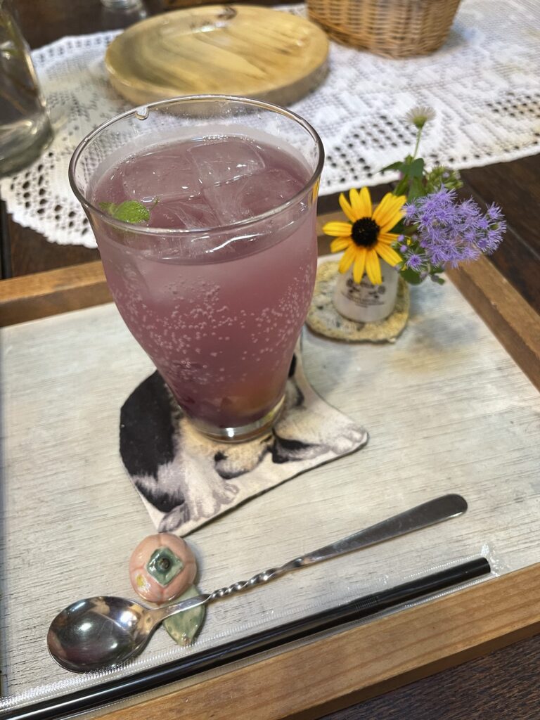 季節のドリンク。ブドウサイダー美味しいですよ。コンポートと、生のぶどう2種類が丸ごと入ってます。