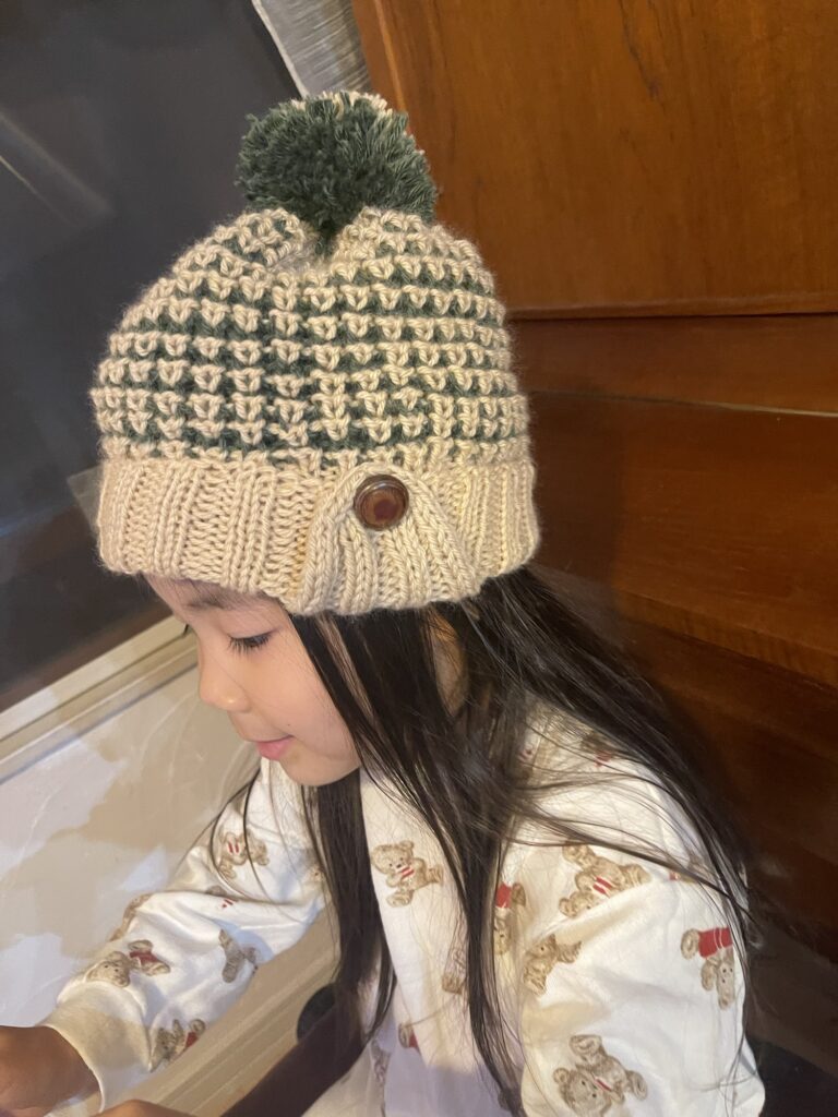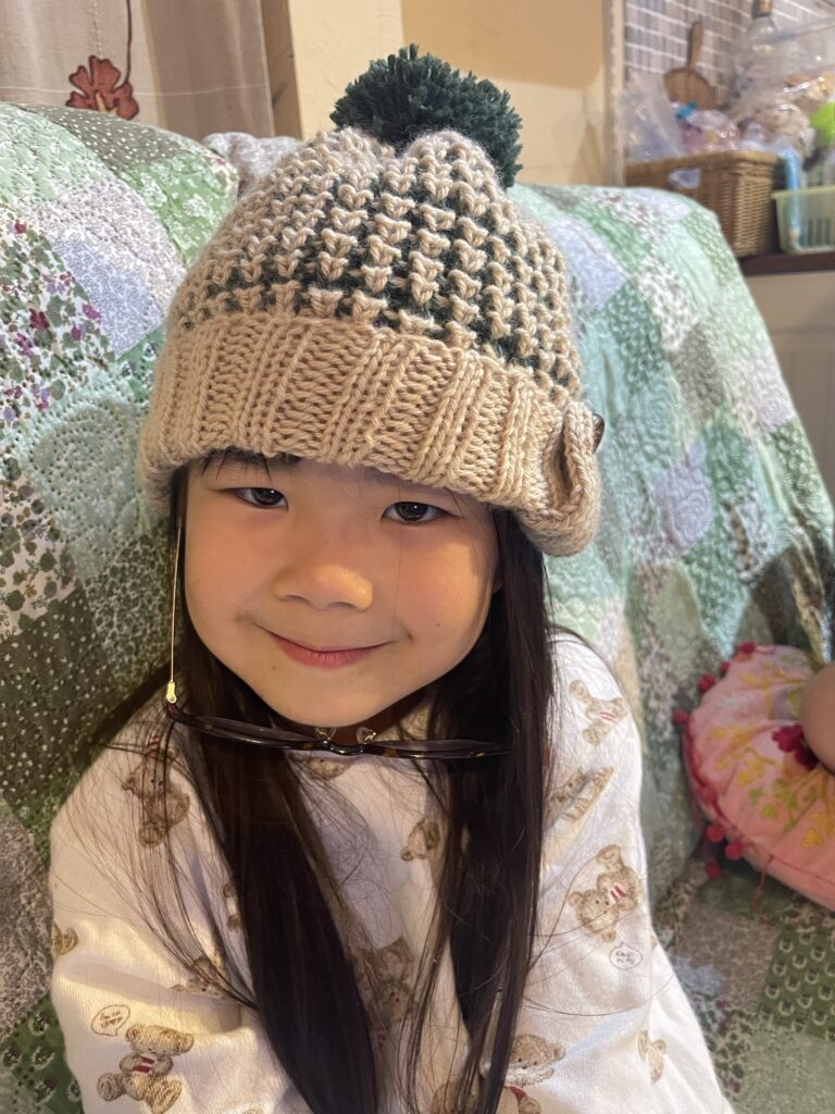 引き上げ編みの方は耳当てを付けました。