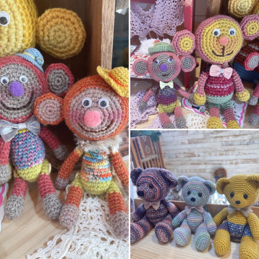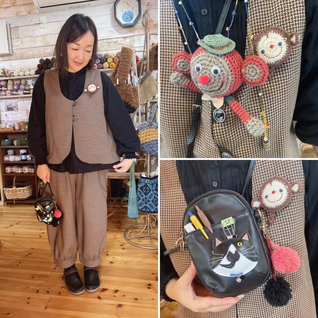 スタッフわかちゃんはザッパファッションぴったりなお猿さんのブローチと編みぐるみ。
