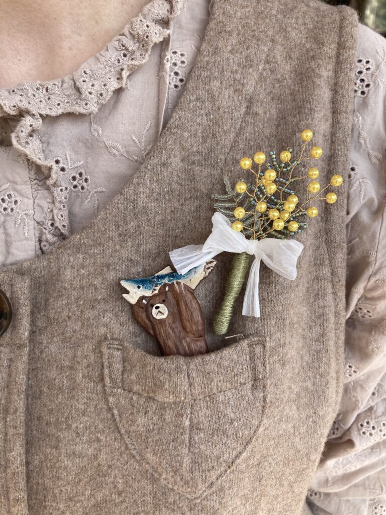 ぴよこ先生のブローチもミモザで可愛いなぁ