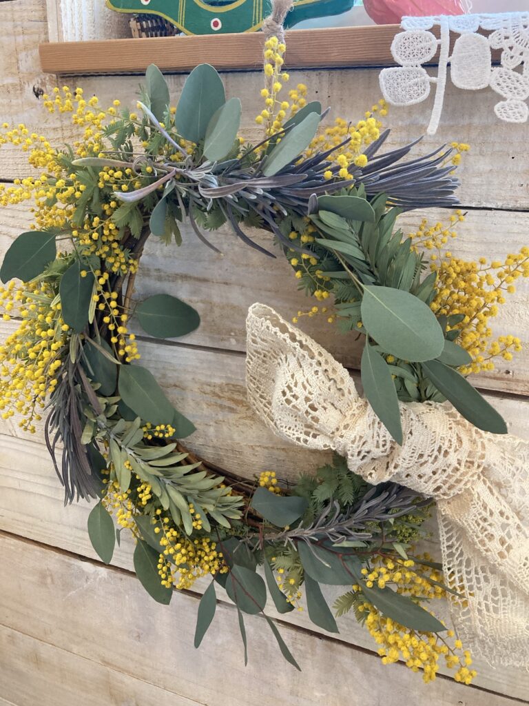 ミモザにユーカリやラベンダーも混ぜてリースを作ってみました