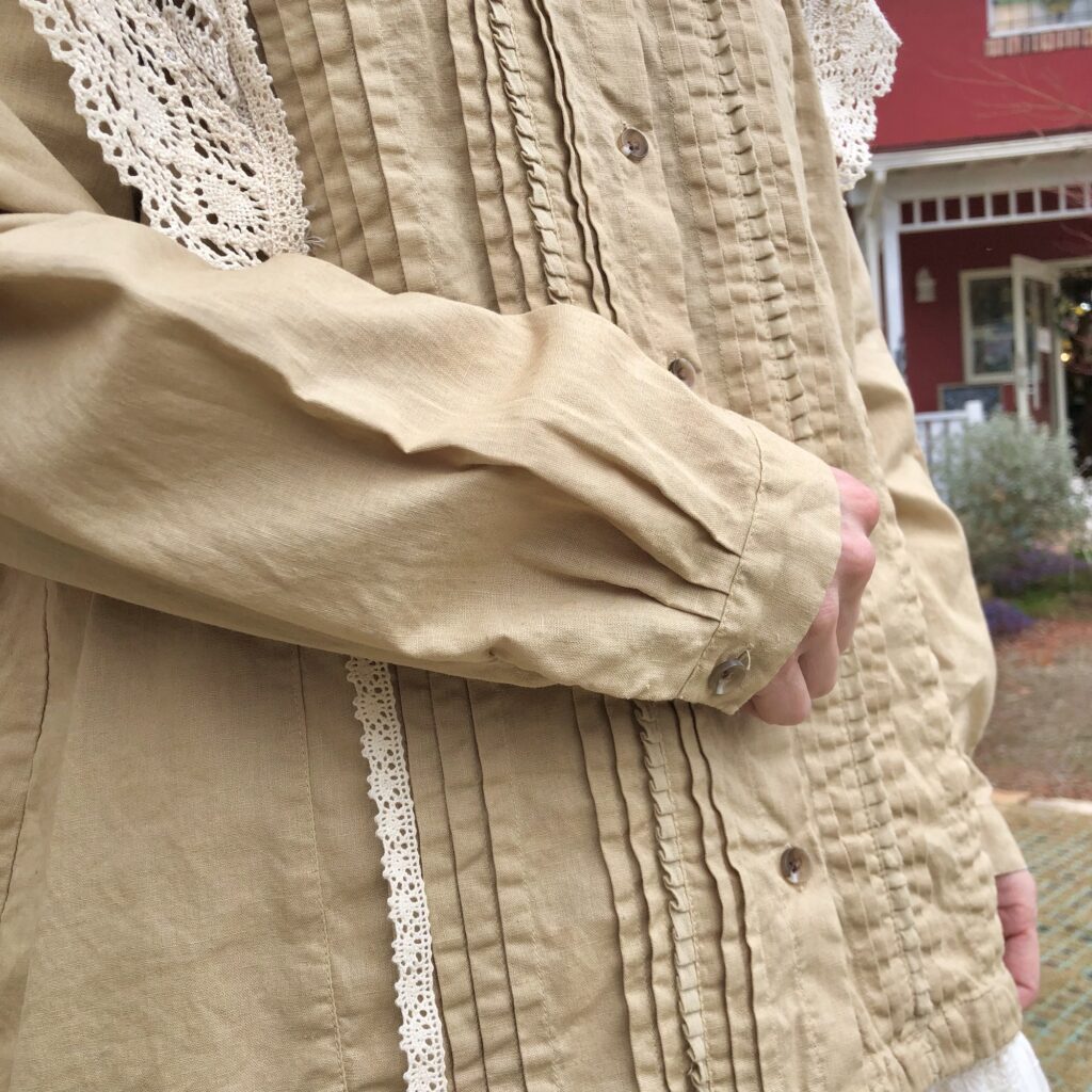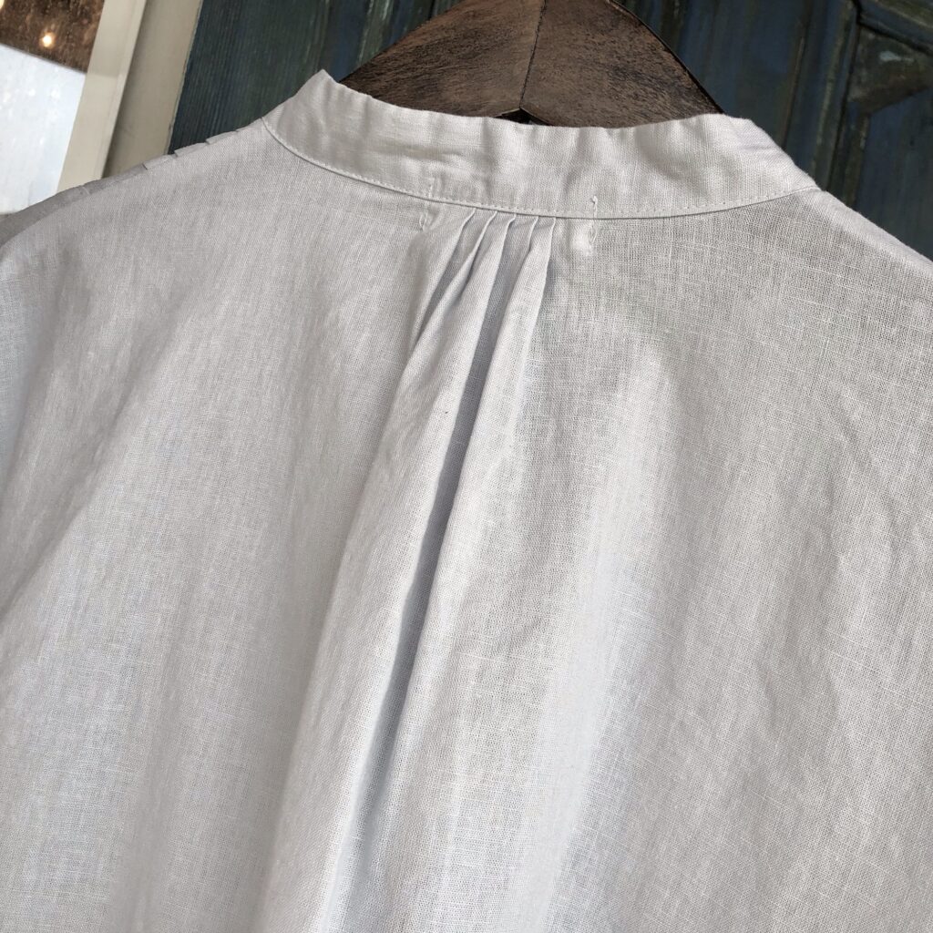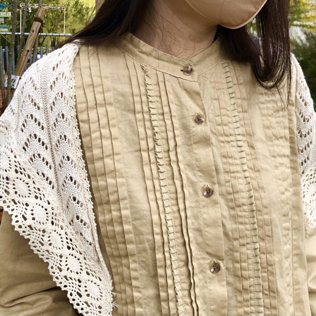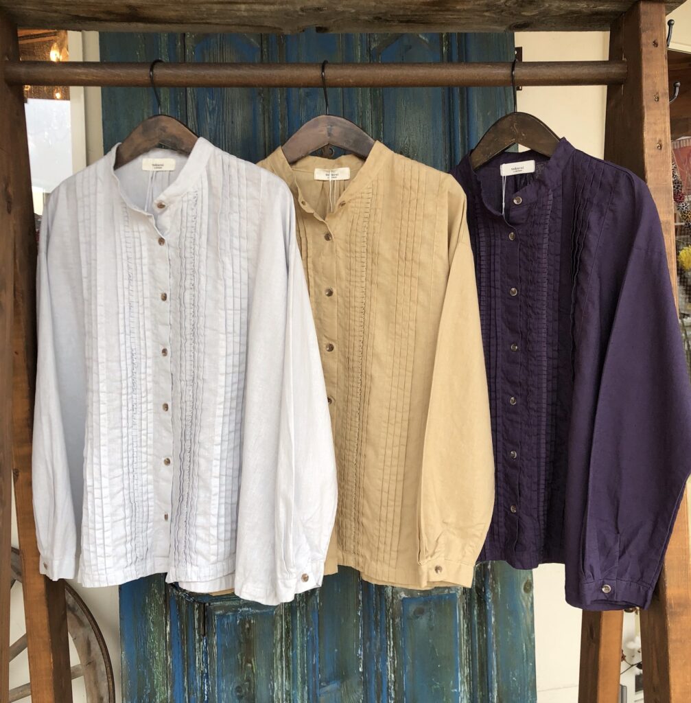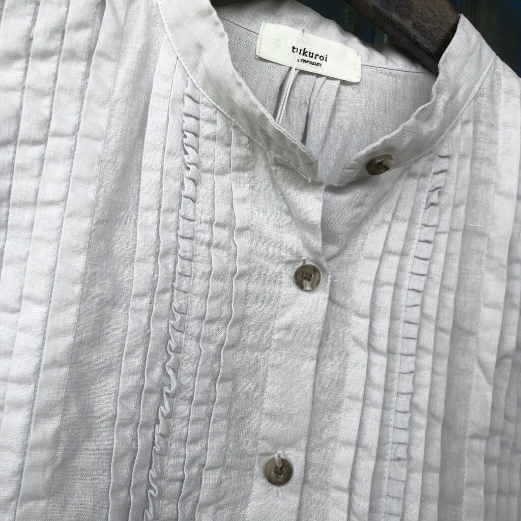 前身頃にはピンタックとフリルを施し、クラシカルな雰囲気に仕上げました。首元はコンパクトなスタンドカラーですっきりとした印象です✨