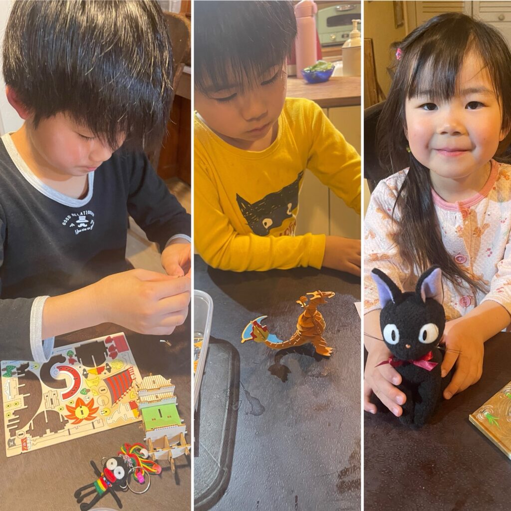 湯布院でお土産に買った、薄い木を重ねて作るおもちゃを2人とも熱心に作ってます。