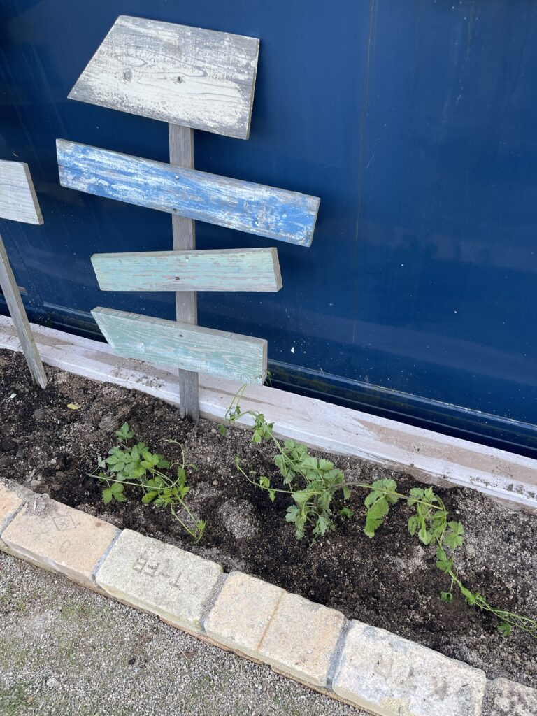 コンテナの前にできた花壇にホップを植えました。コンテナを覆い尽くすことでしょう。