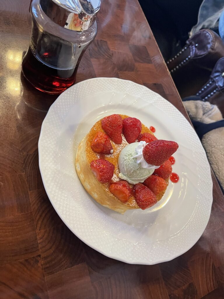けいこさんはいつも少食でイチゴのパンケーキとコーヒー。