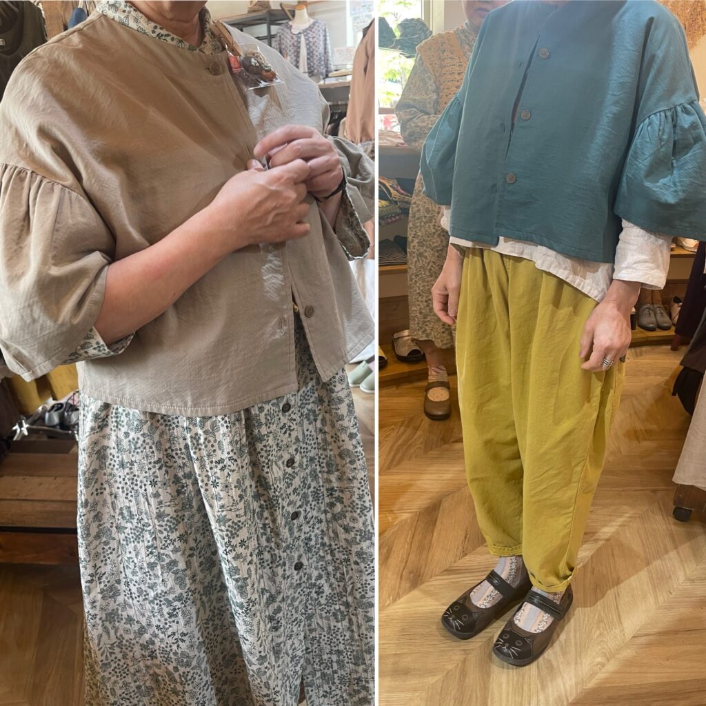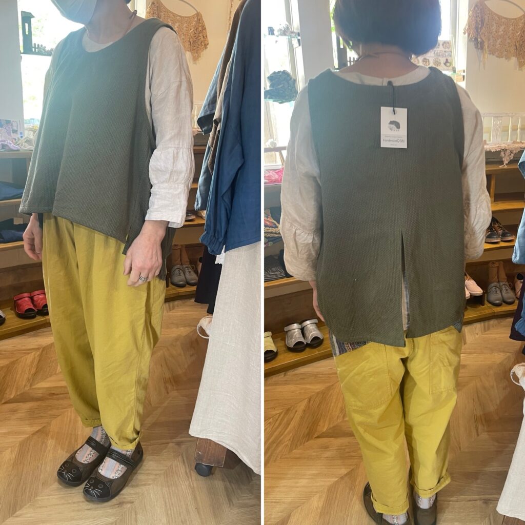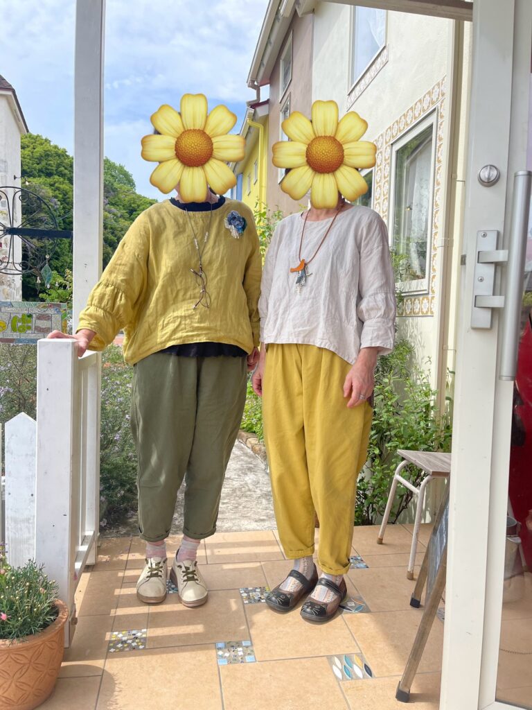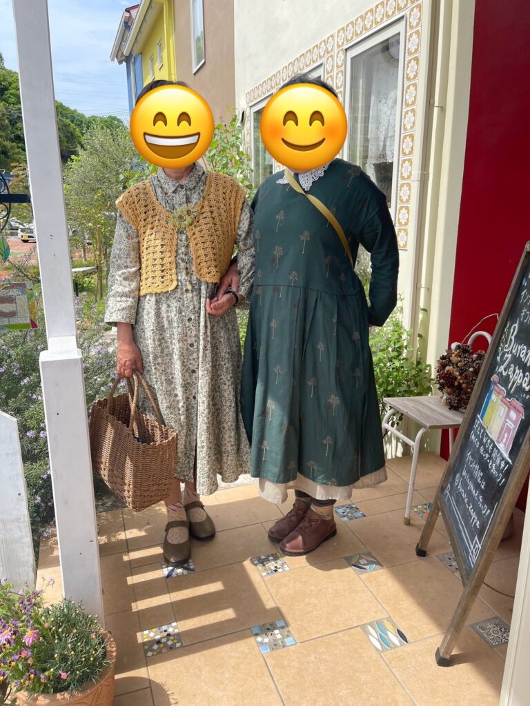 ザッパのワンピースに、お母様の手編みベスト。お二人とも小物使いもお上手。