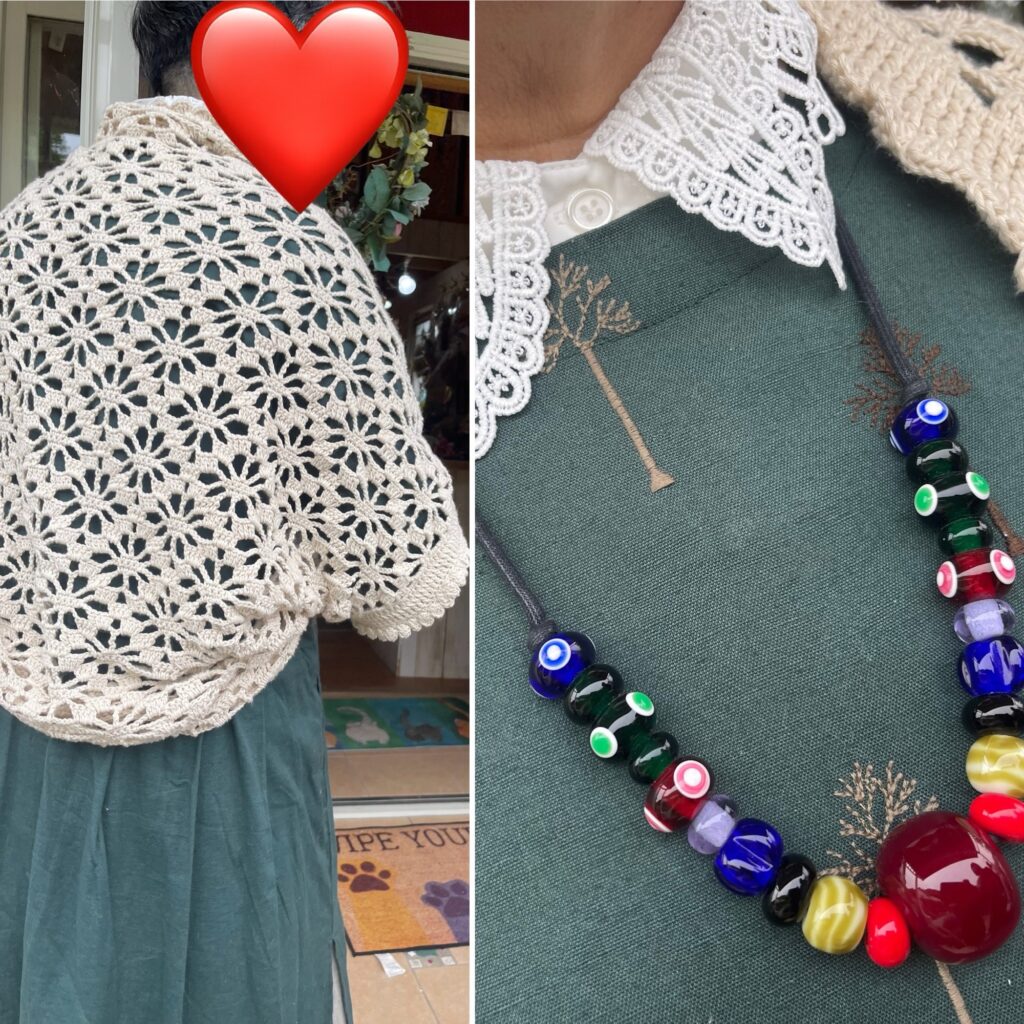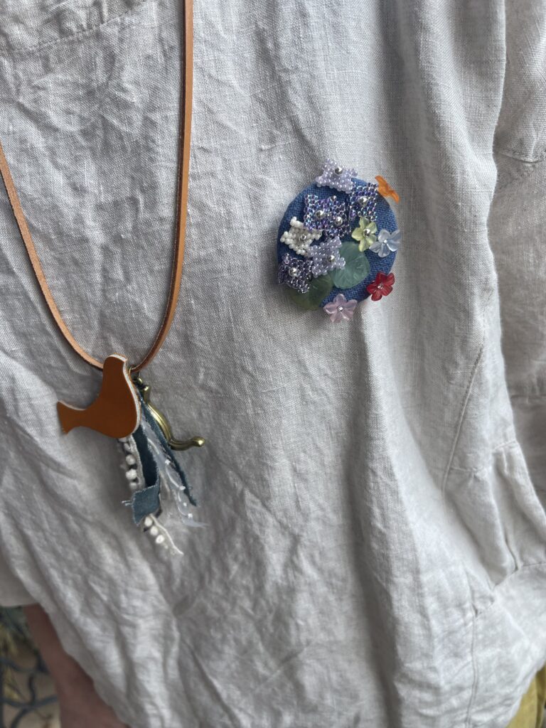 私が昔作ったブローチを火曜市でお買い上げいただき、2個付けしてくださってます。