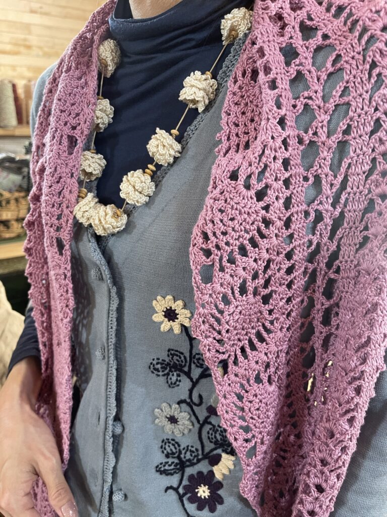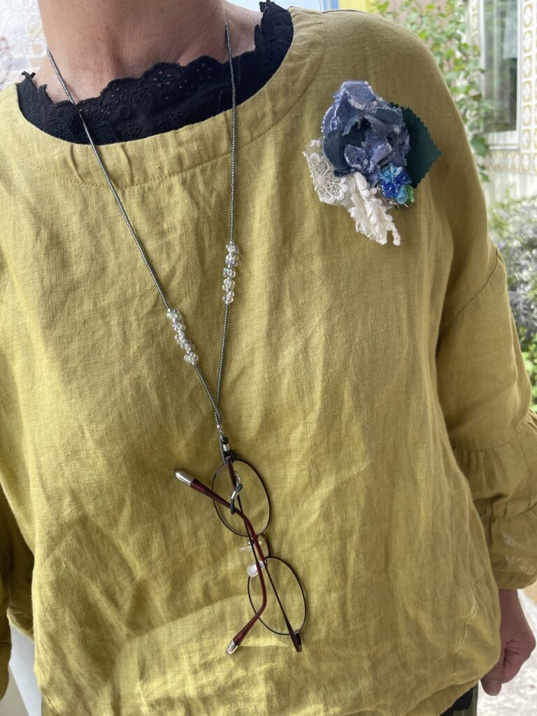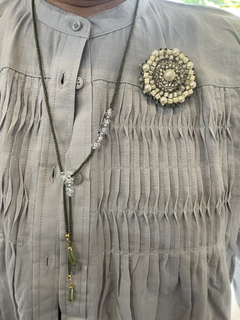 咲き織の先生は先日ビーズ教室で作られたラリエットと、何年か前に作られたという素敵なビーズブローチ