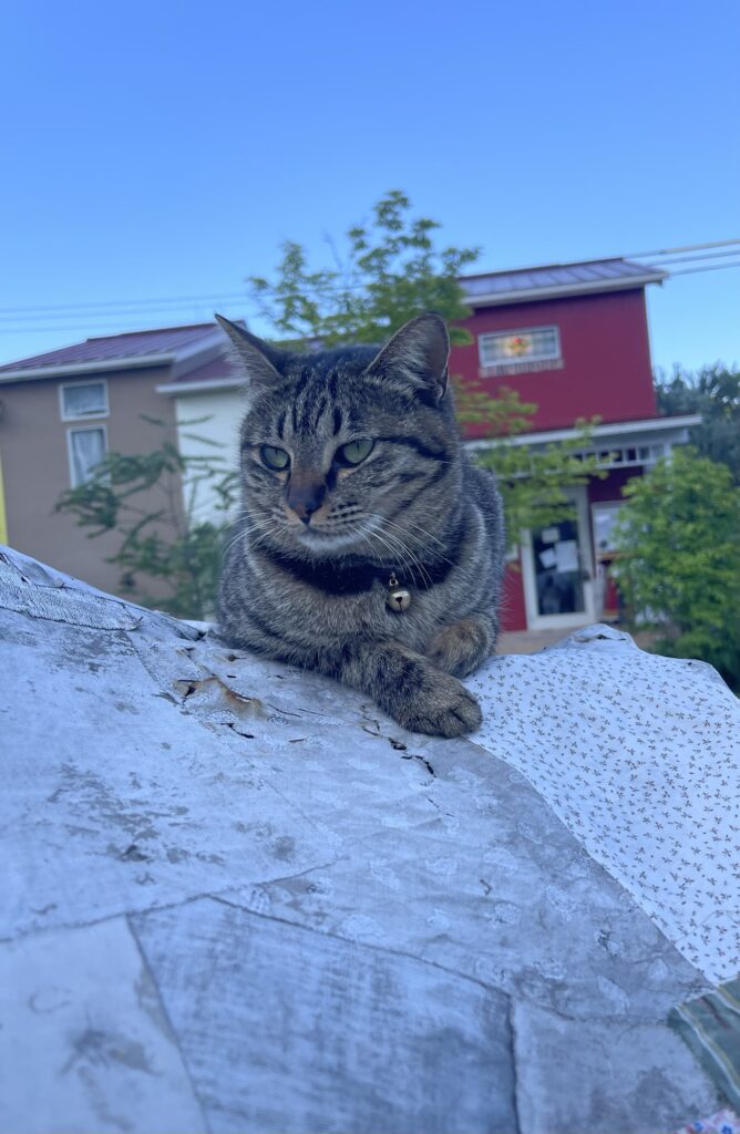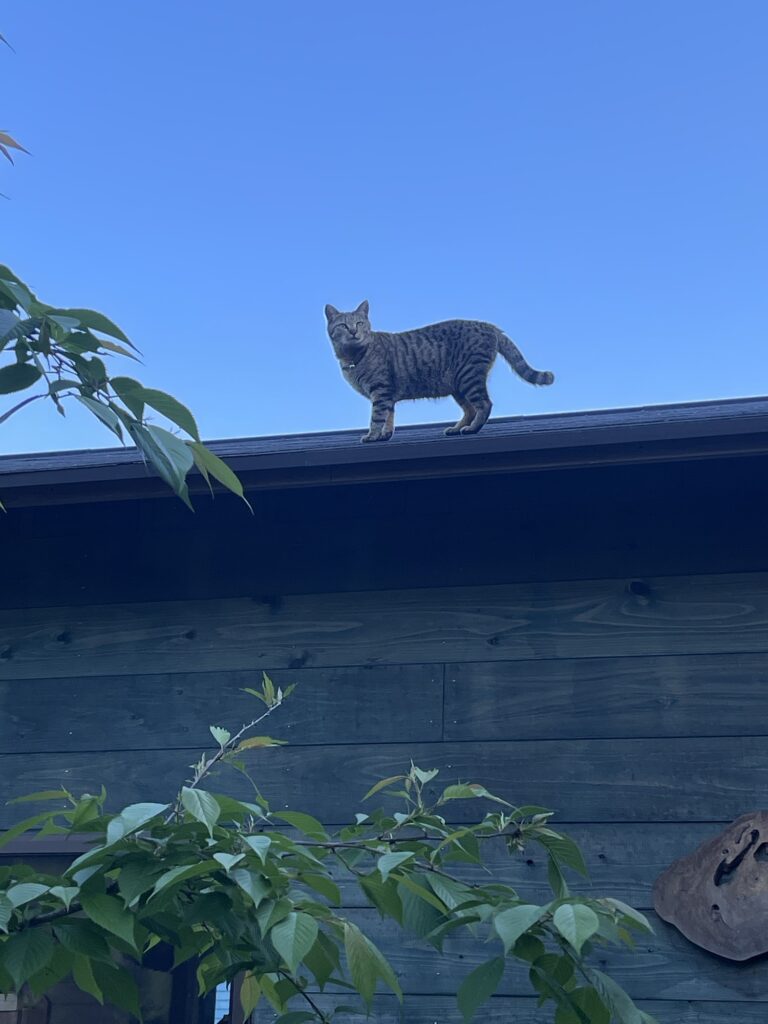 綿小屋の屋根の上にてこちゃんが、