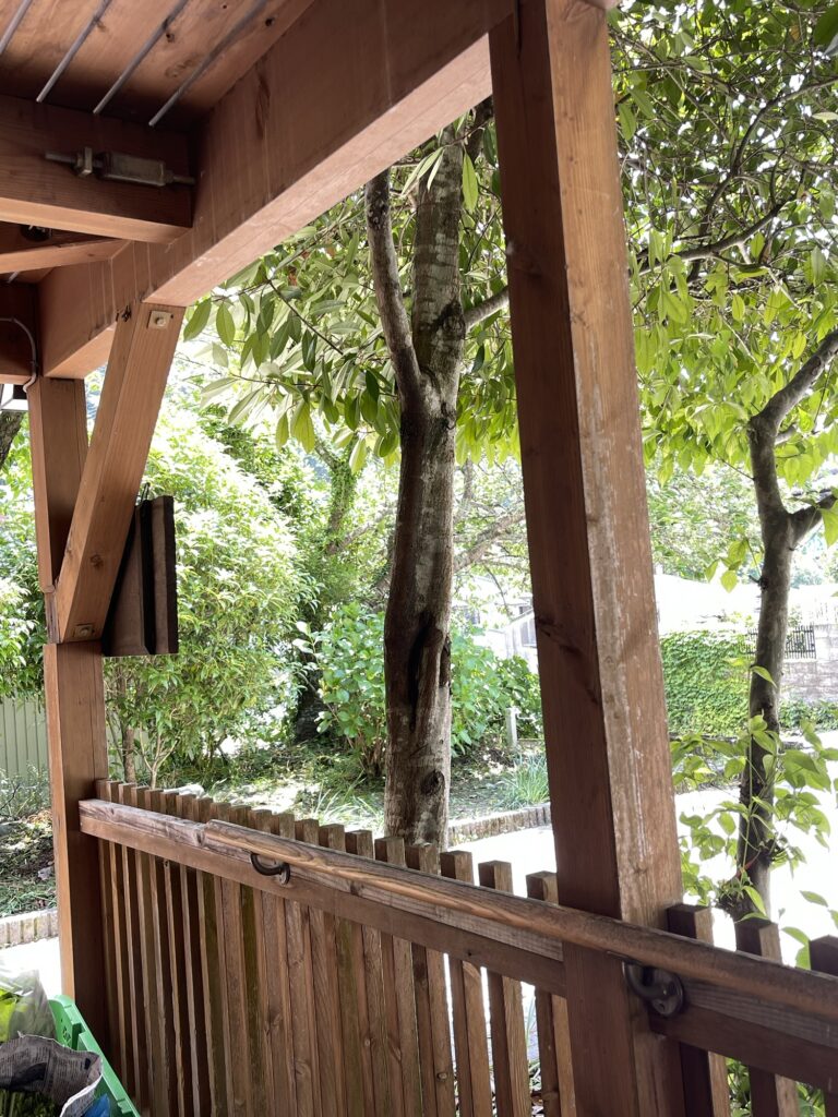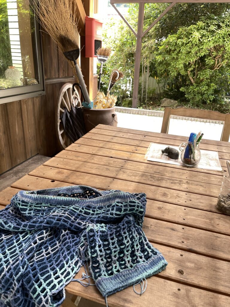 ウッドデッキで編物をしてると緑の木陰が