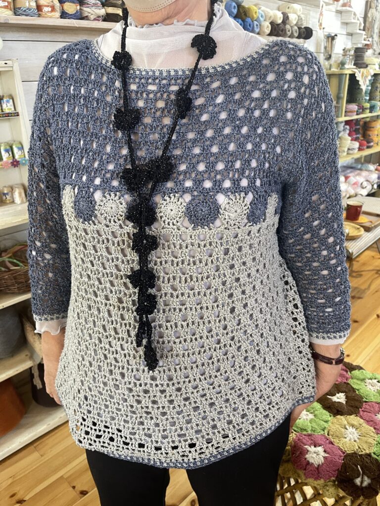 咲き織と、編物の先生は今日も素敵な手編みのプルオーバーとラメ入りのラリエット。