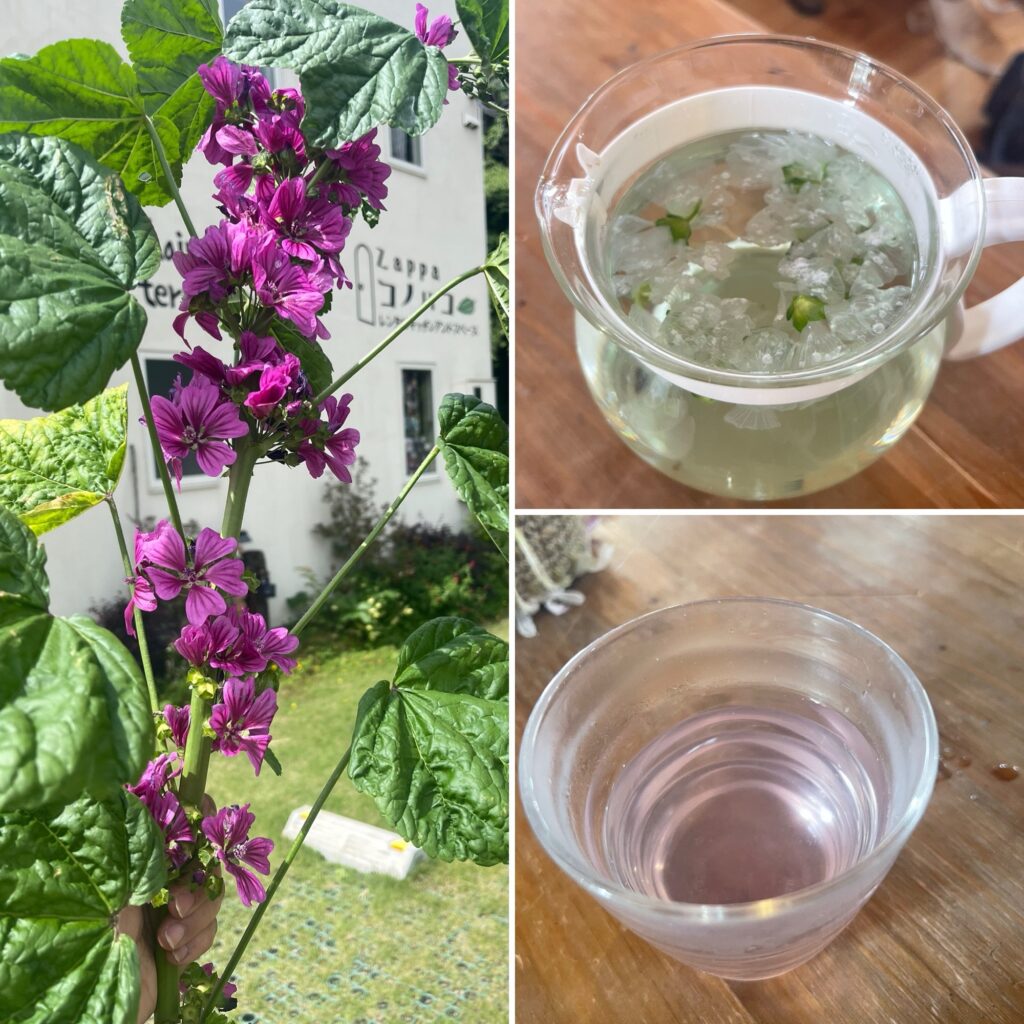 色がブルーから綺麗なピンクに変化するマロウのお茶をみんなで試飲。