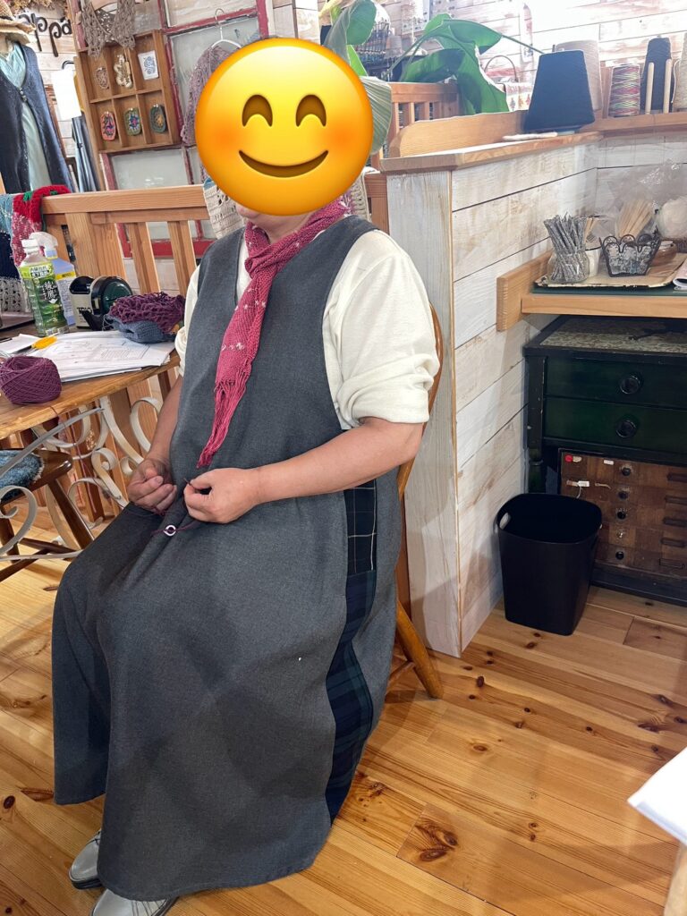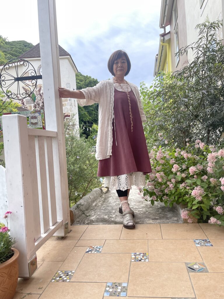 サイドに播州織のパッチワークを施したザッパワンピに、手織りのストール。