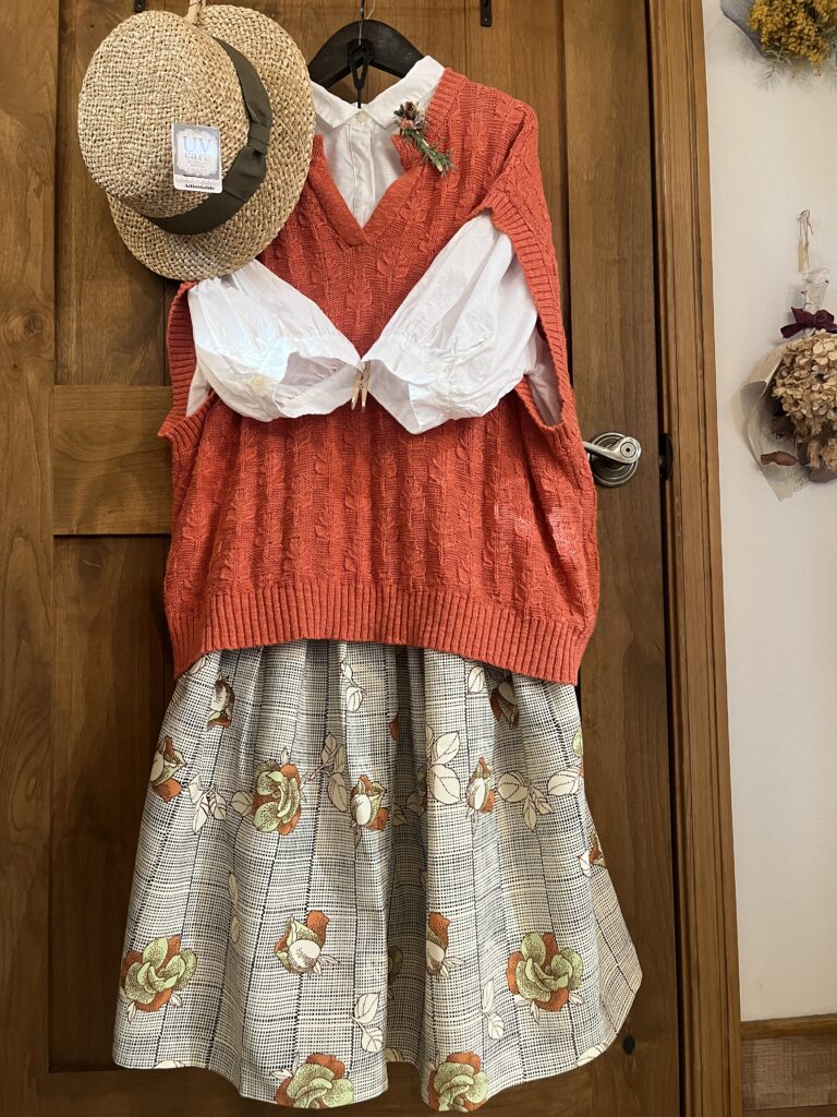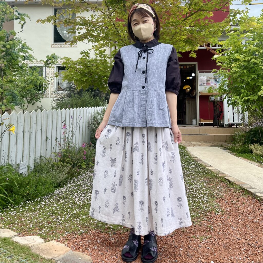 輸入生地を使ったオリジナルスカートに、tukuroiの綿麻のニットベストを重ねてますね。