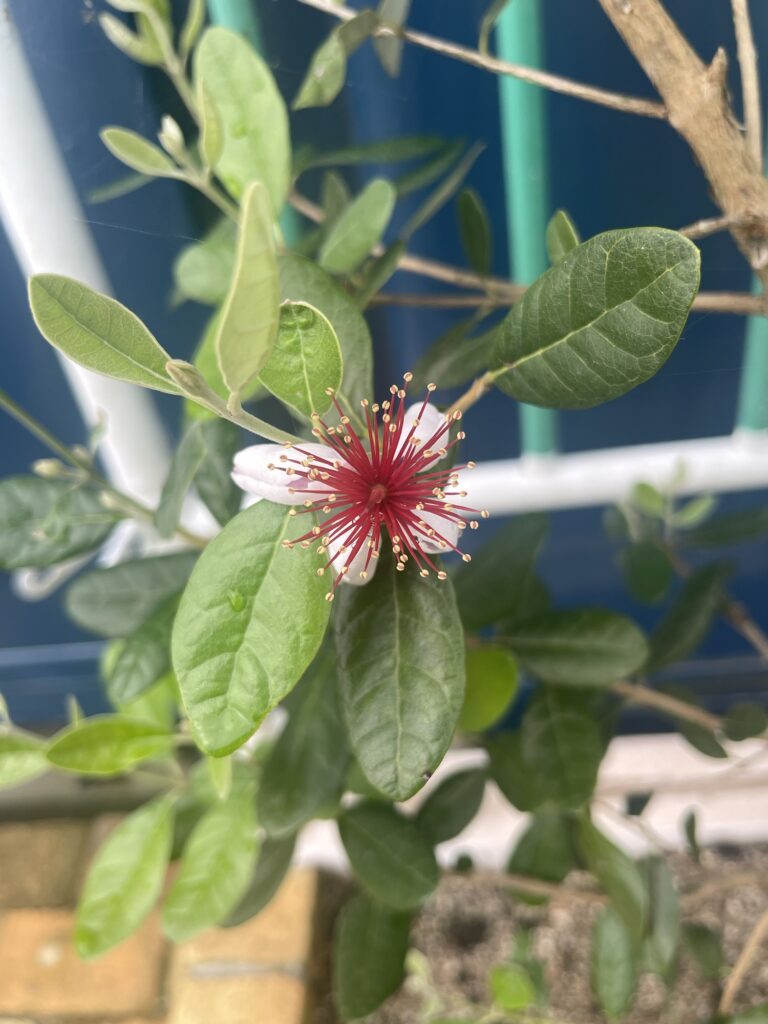 フェイジョアの鮮やかなお花が咲いてました。実がなるといいなあ。すごく芳醇な香りでおいしいのですが、なかなかお店では売ってないフルーツなんです。
