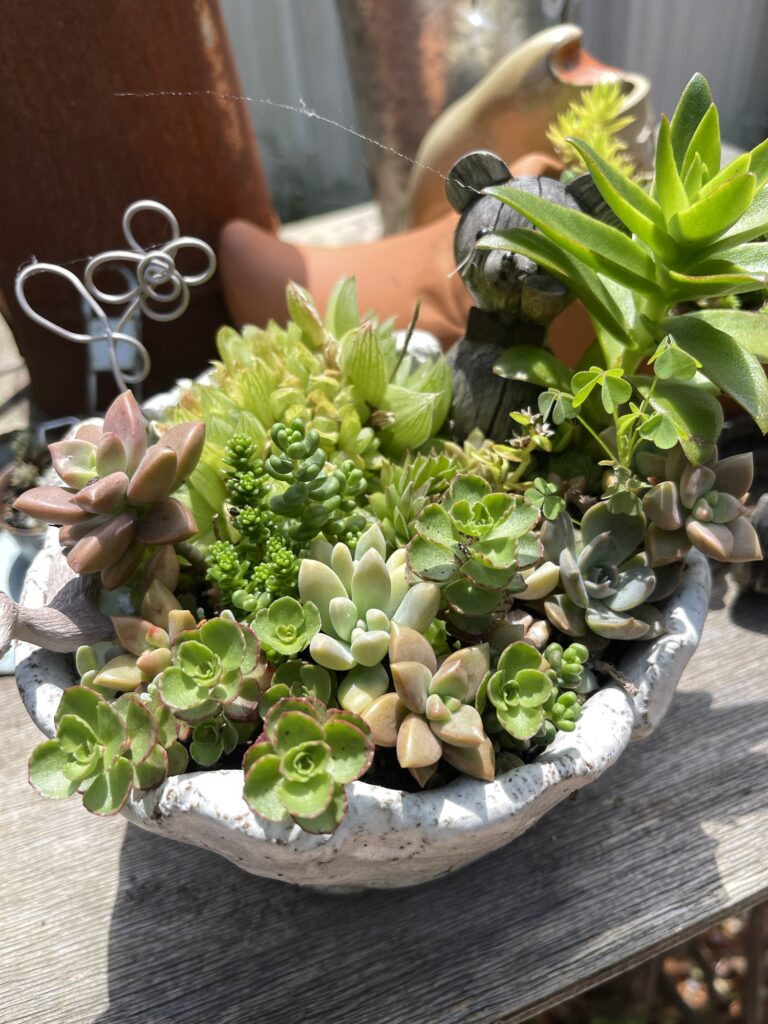 手焼きの器にちぎって放り込んだ多肉が、