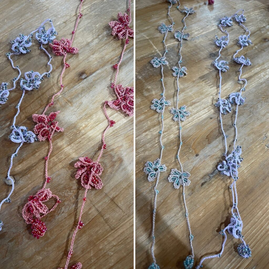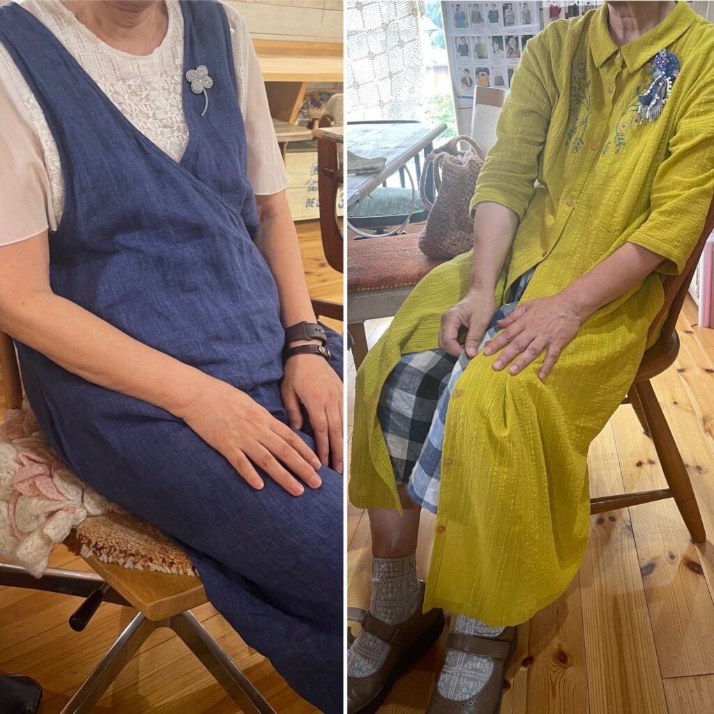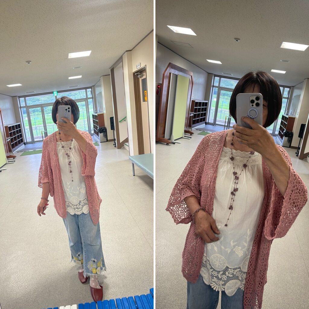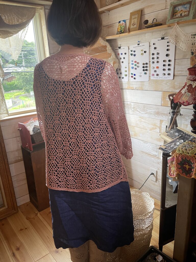 私はかぎ針編みのカーディガンを、ペチの上に羽織ってます。シルクコットンの糸で編んだのでとっても涼しいです。