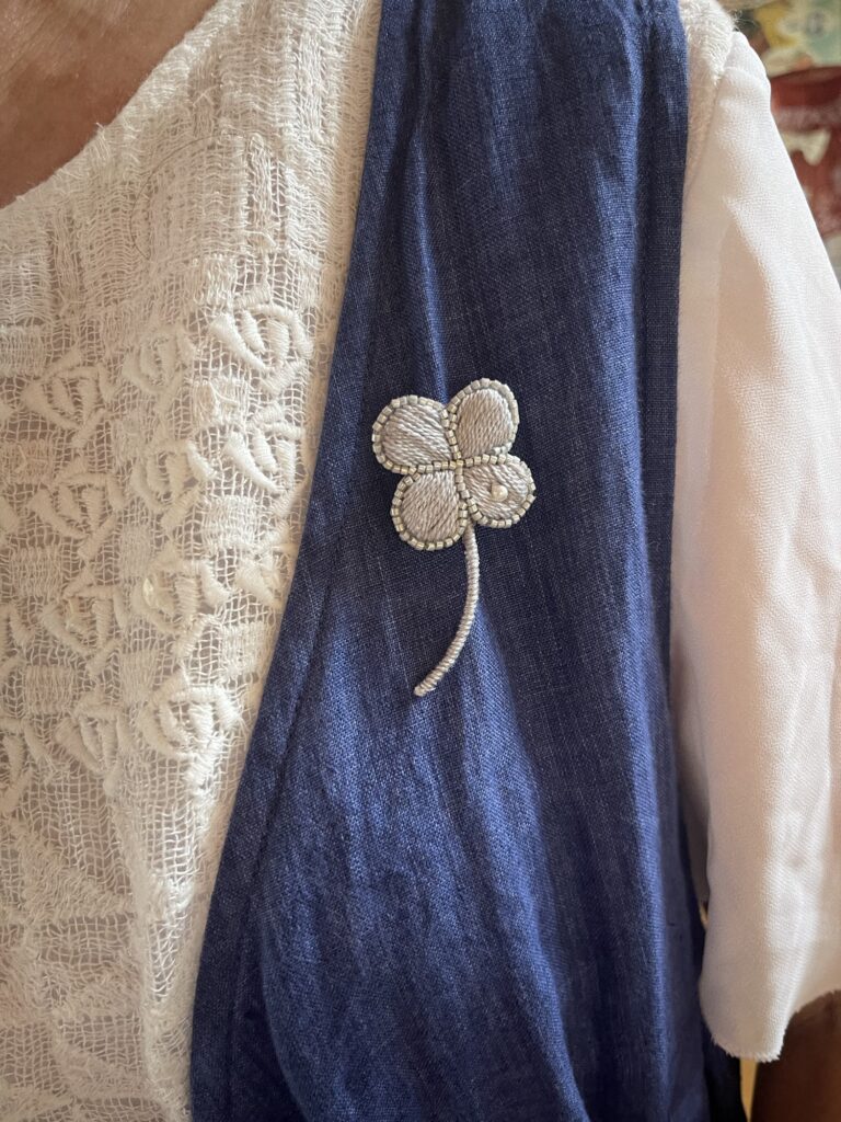 カシュクールワンピと白いブラウスに、クローバーのブローチがよく似合う。