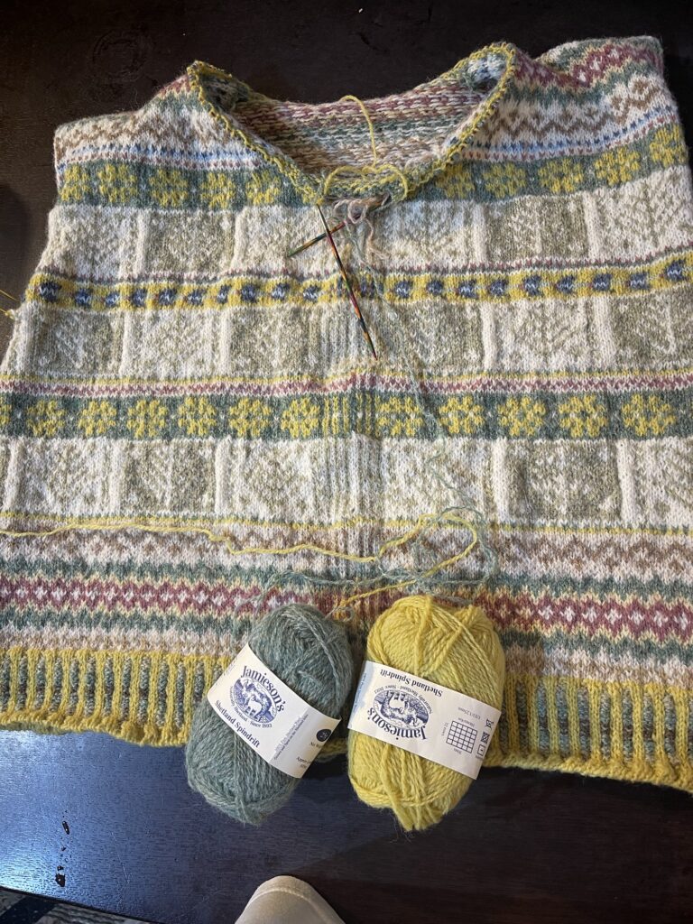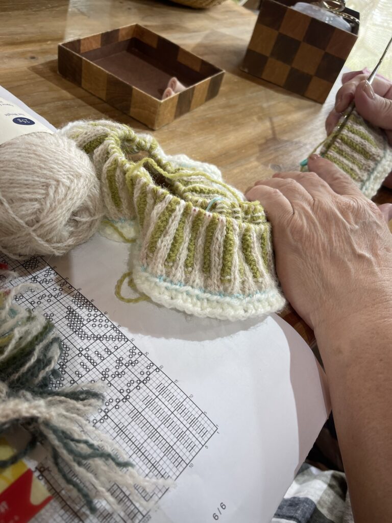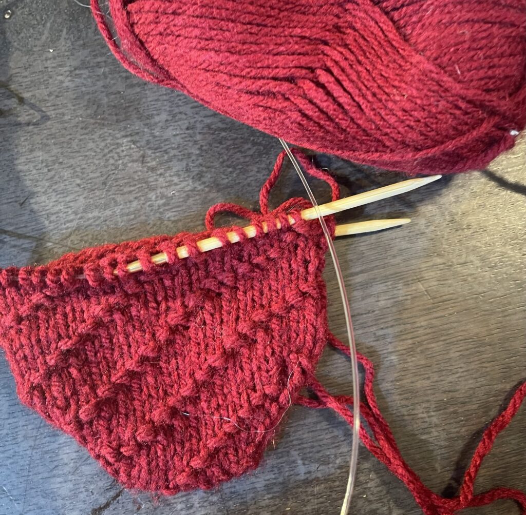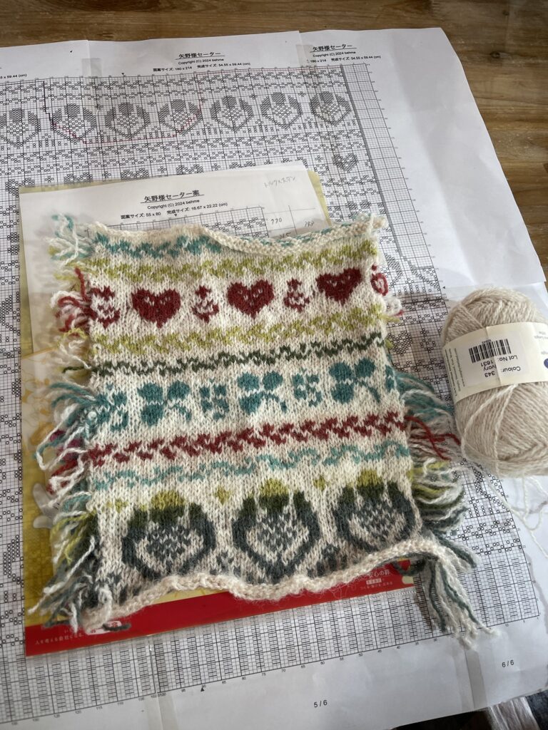 ハサミを入れて、スティークを織り込みながら拾います。早く編みたいけど他に編むものが多すぎてなかなか進まないわー💦