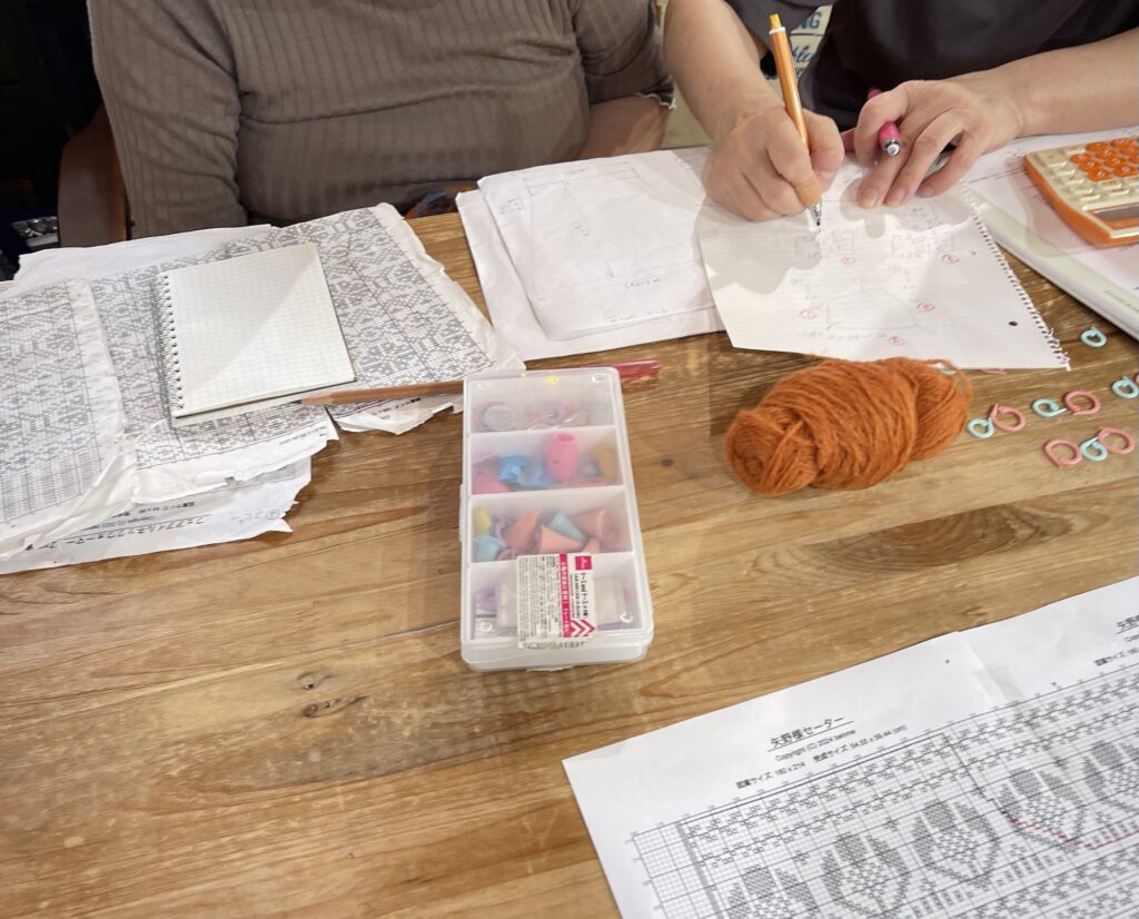 私はカーディガンの首周りの目を拾っているところ。前立ては首周りを往復編みしてから、