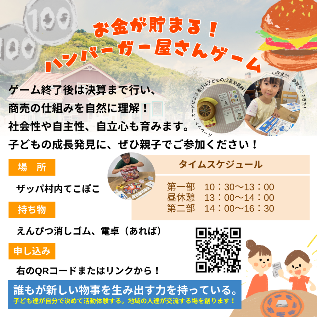 親子で楽しく学べる!ザッパ村ハンバーガー屋さんゲーム開催のお知らせです♪