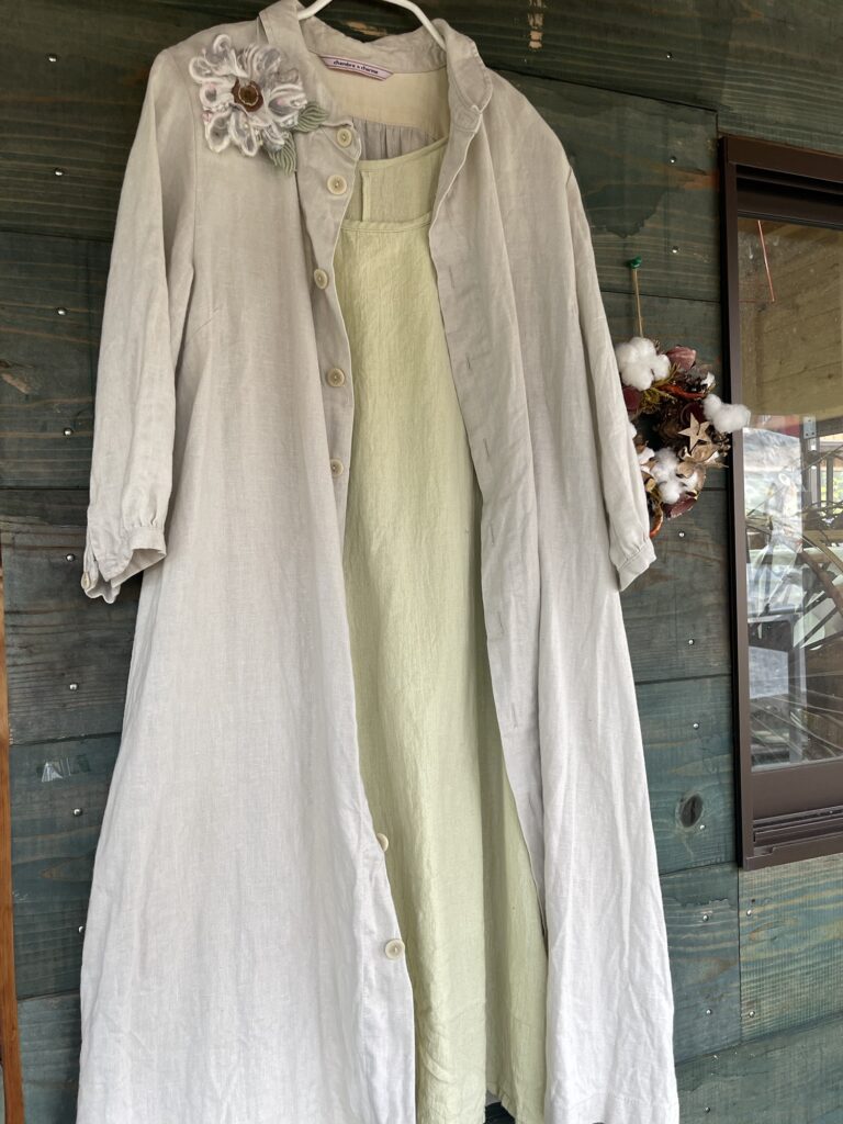 コットンのワンピースに、リネンの前あきワンピ。お花のコサージュ。