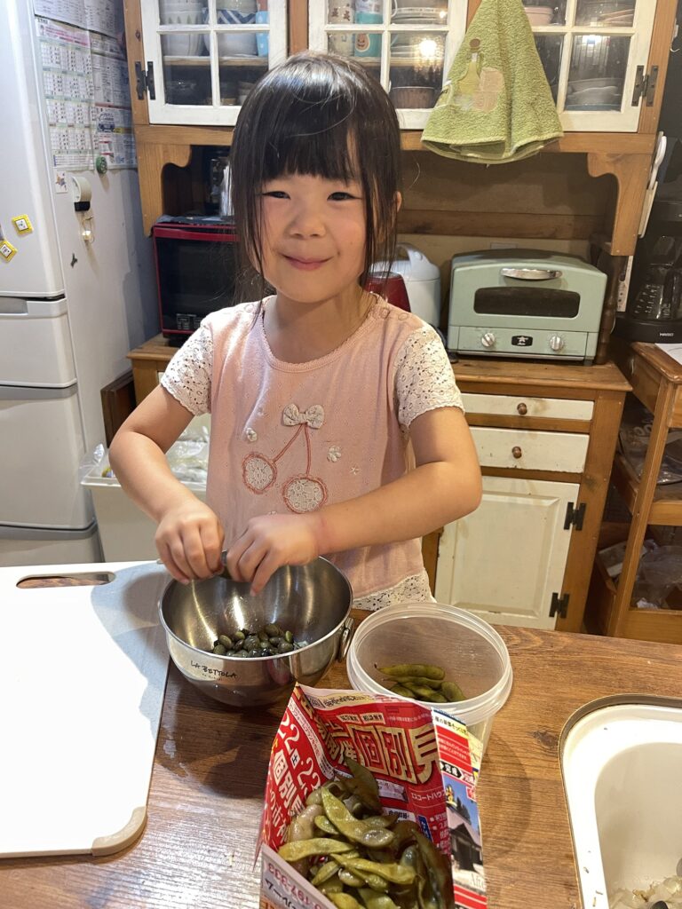 最近お料理のお手伝いをしたがるうーちゃん。今日は枝豆の皮剥きを頑張ってたくさんしてくれました。いろんなお野菜を入れてミキサーで細かく砕いてポタージュスープを作ったら、みんなよく食べてくれました。