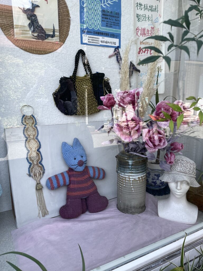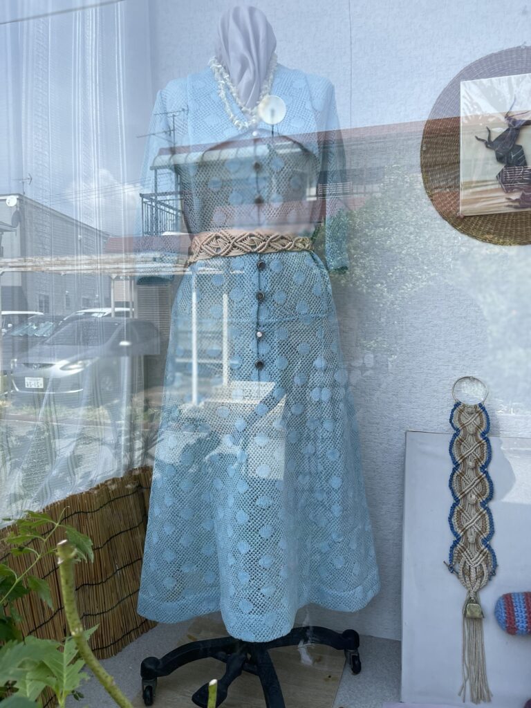 教室のウインドウ。機械編みのワンピース 。