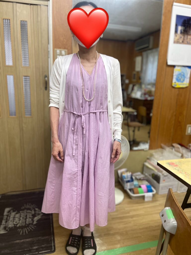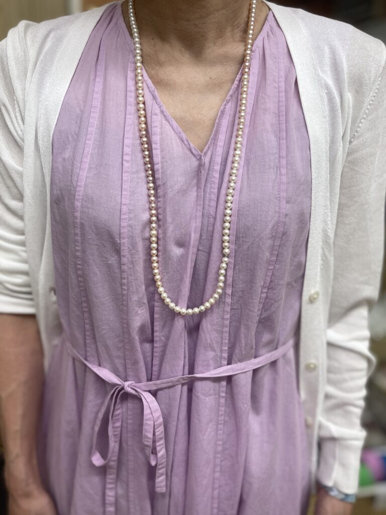 けいこさんが、パールのネックレスを付けてみました。ピンクのワンピースによく似合ってるねー!試験終わったらご褒美に欲しいね。