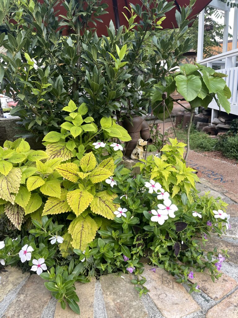 暑くてもお庭のコリウスやニチニチソウは元気に咲いてます。
