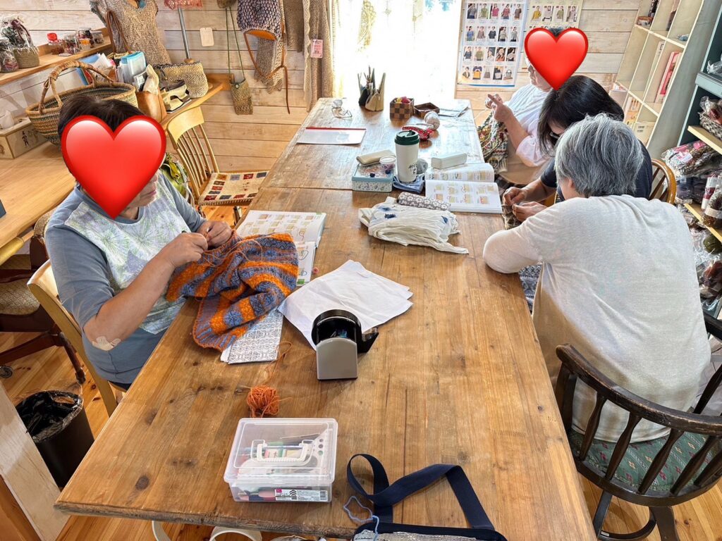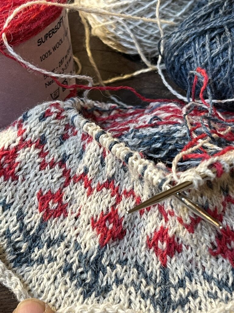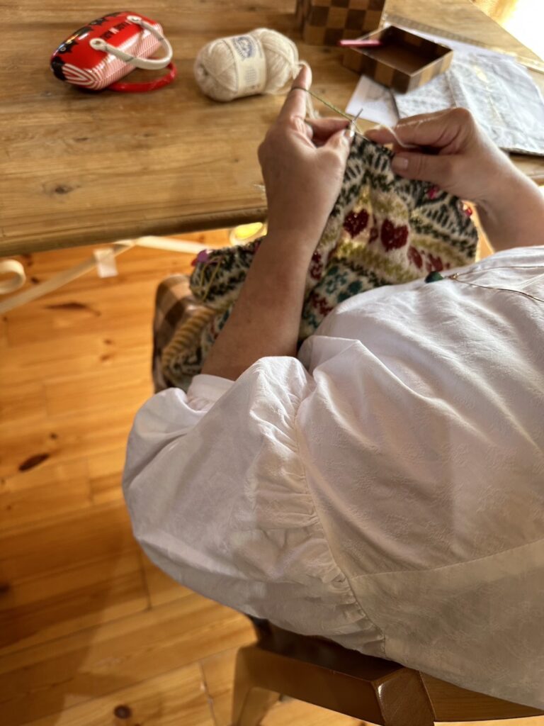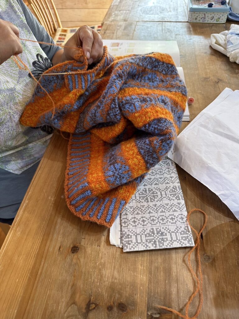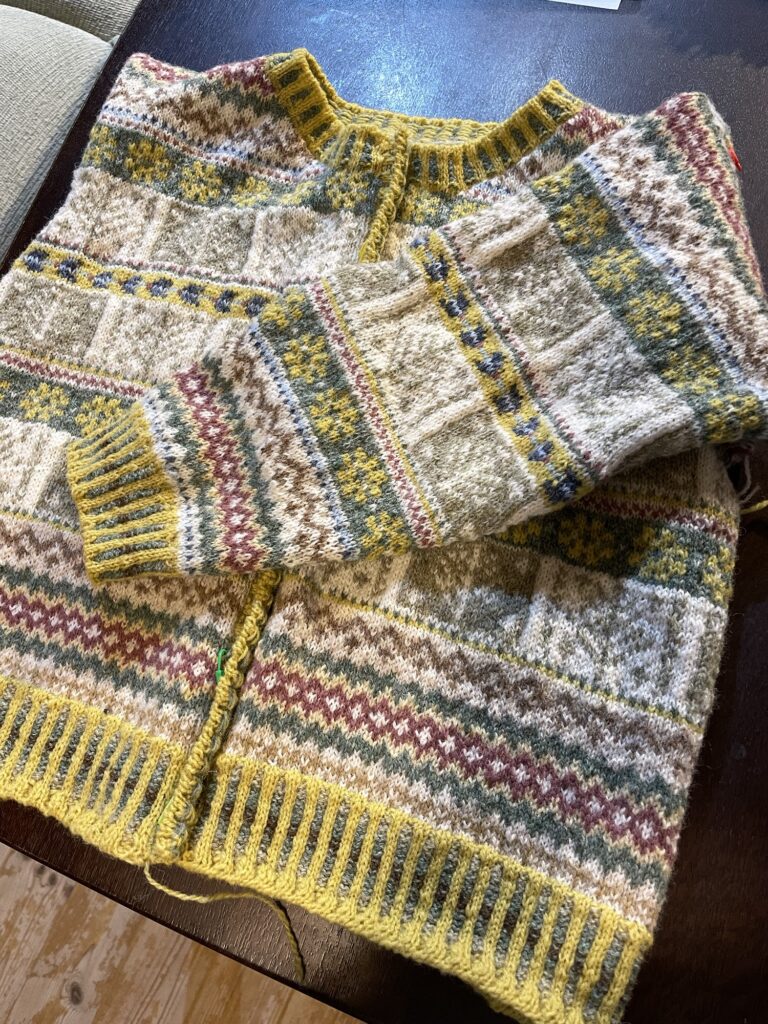 私は今日は外に出る用事があって一緒には編めなかったのですが、お家でコツコツ編んでいます。他にもたくさん編みたいものがありすぎて、少しづつしか進みませんが、フェアアイルは編みはじめると、次々と編みたくなります。今は片袖編めたところ。