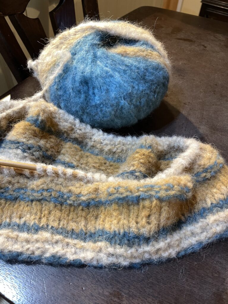 編み込みのバッグとか、他にも靴下も編みかけ。あれこれ編む場所によって編むものを変えてます。
