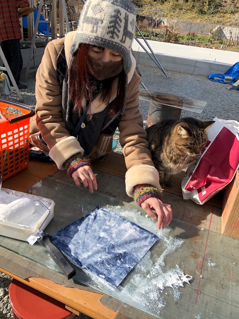 はりこの技術を使って、布を貼り付けたらおもろいんちゃうか!?と言い出して、やってみたら、めっちゃいいやーん!と盛り上がりました。